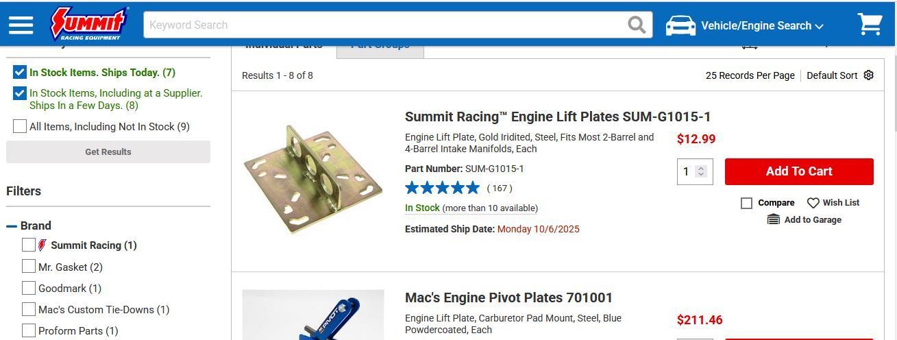 You can lift it using a 2BBL carb lift plate on the center of the intake where the carb bolts to the intake or find a set of OEM lift brackets which attach to the intake bolts where I circled in yellow.