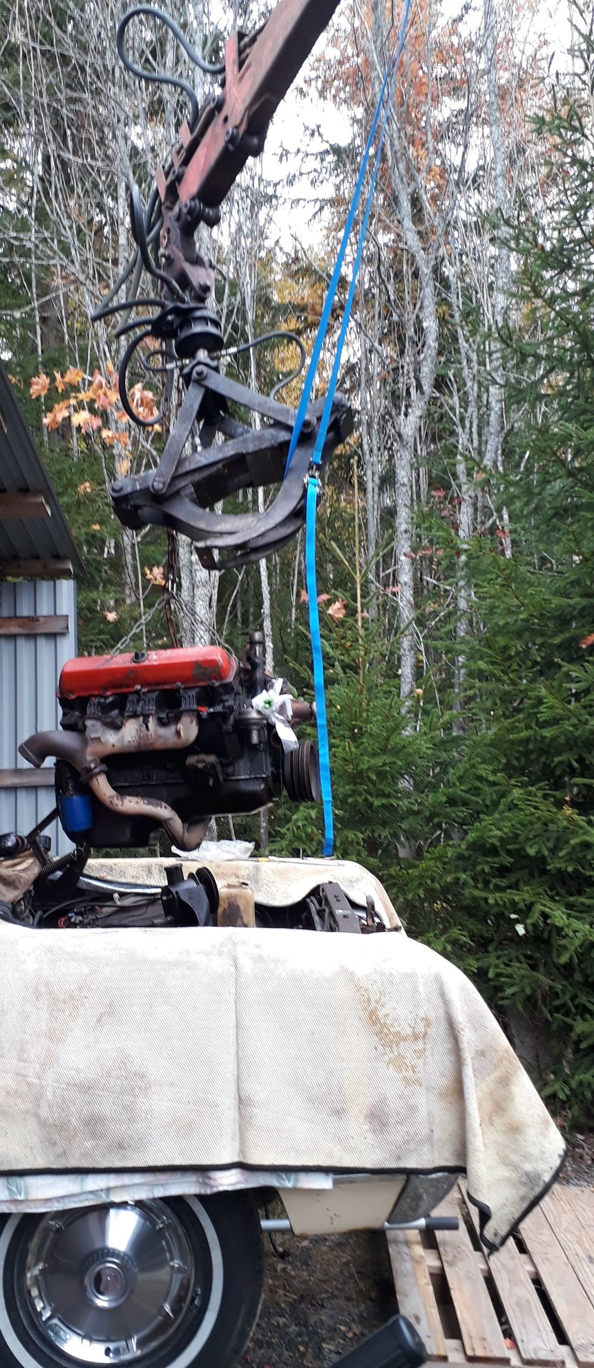 I saved some lovely pictures of a 425 being yanked out of a '67 Toronado. I believe this is BSeigPaint's car and it shows the attachment points for the engine hoist very well.