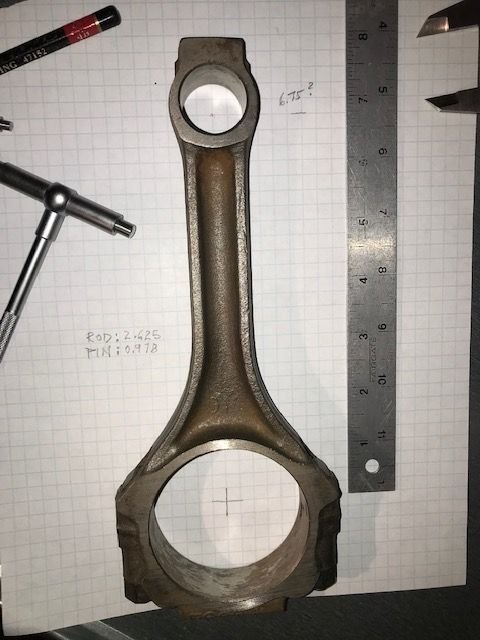 Next question, a set of rods came with engine, how to identify them? I quickly miked them Rod: 2.625, Pin: 0.978, Length (center to center - rough): 6.75, Big End Width: 0.937. Looked in Travato's book and my numbers pretty much match his except for length which I just estimated using a ruler and graph paper - could easily be 6.735. No numbers that I can read except a "GM" cast near the big end. I assume they are press-in bolts with either an "S" or "N" stamped on top.