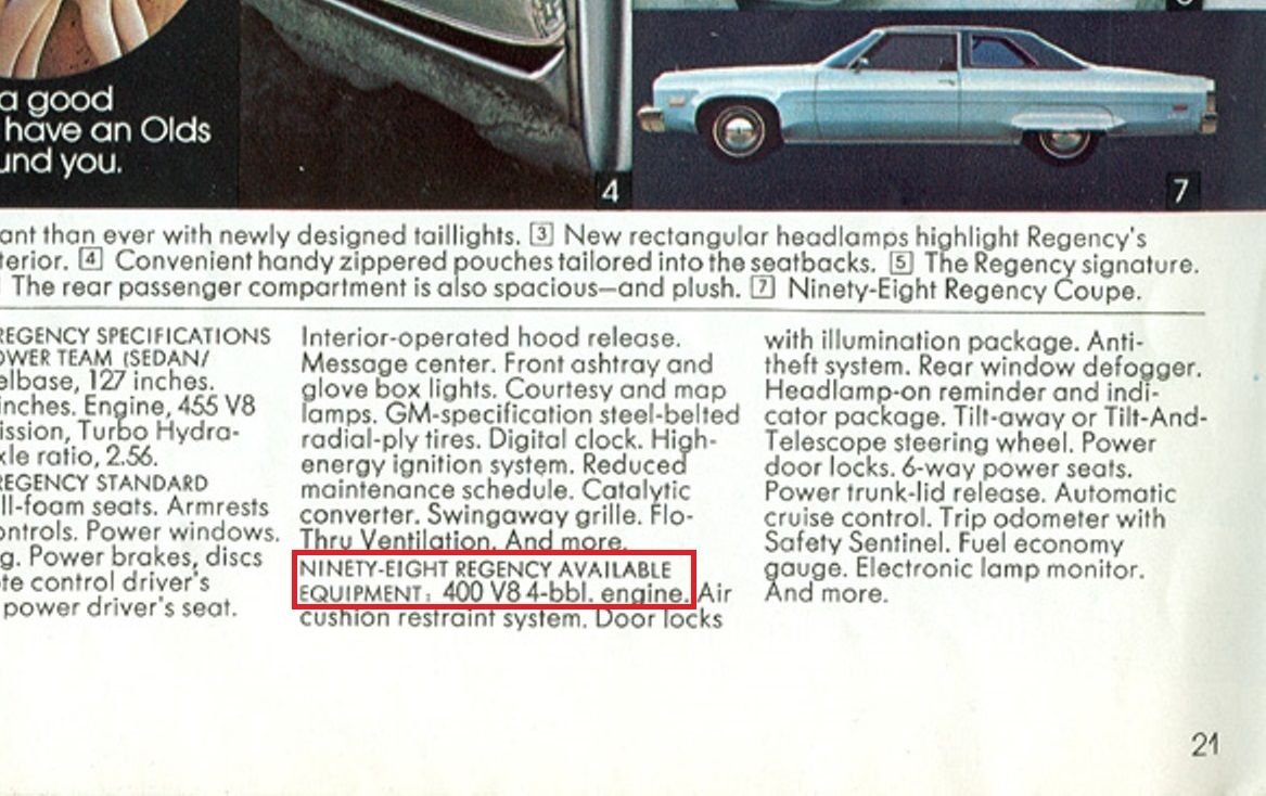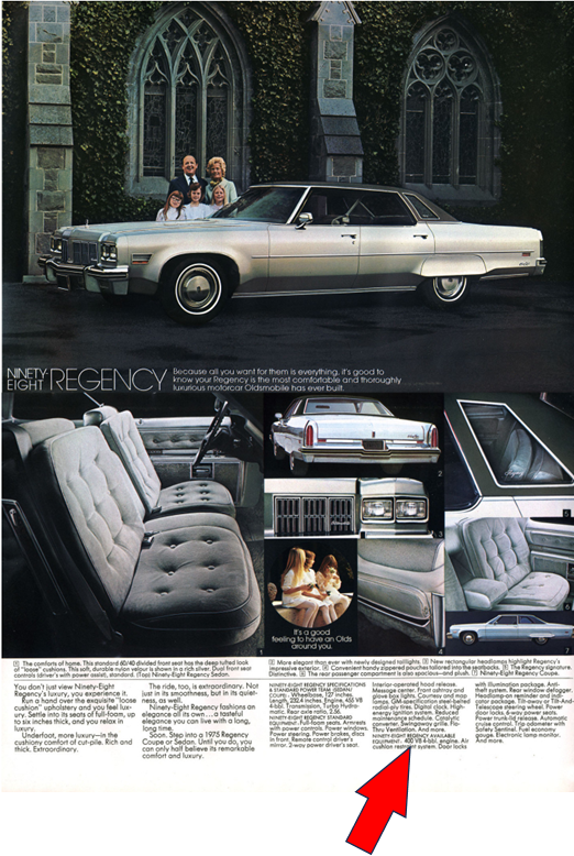 Before anyone starts squalling that there were no 400 engines in 1975 Oldsmobiles, the Pontiac 400ci engine, either 2bbl or 4bbl, was available in 1975 Delta 88, Ninety Eight, and Custom Cruiser.