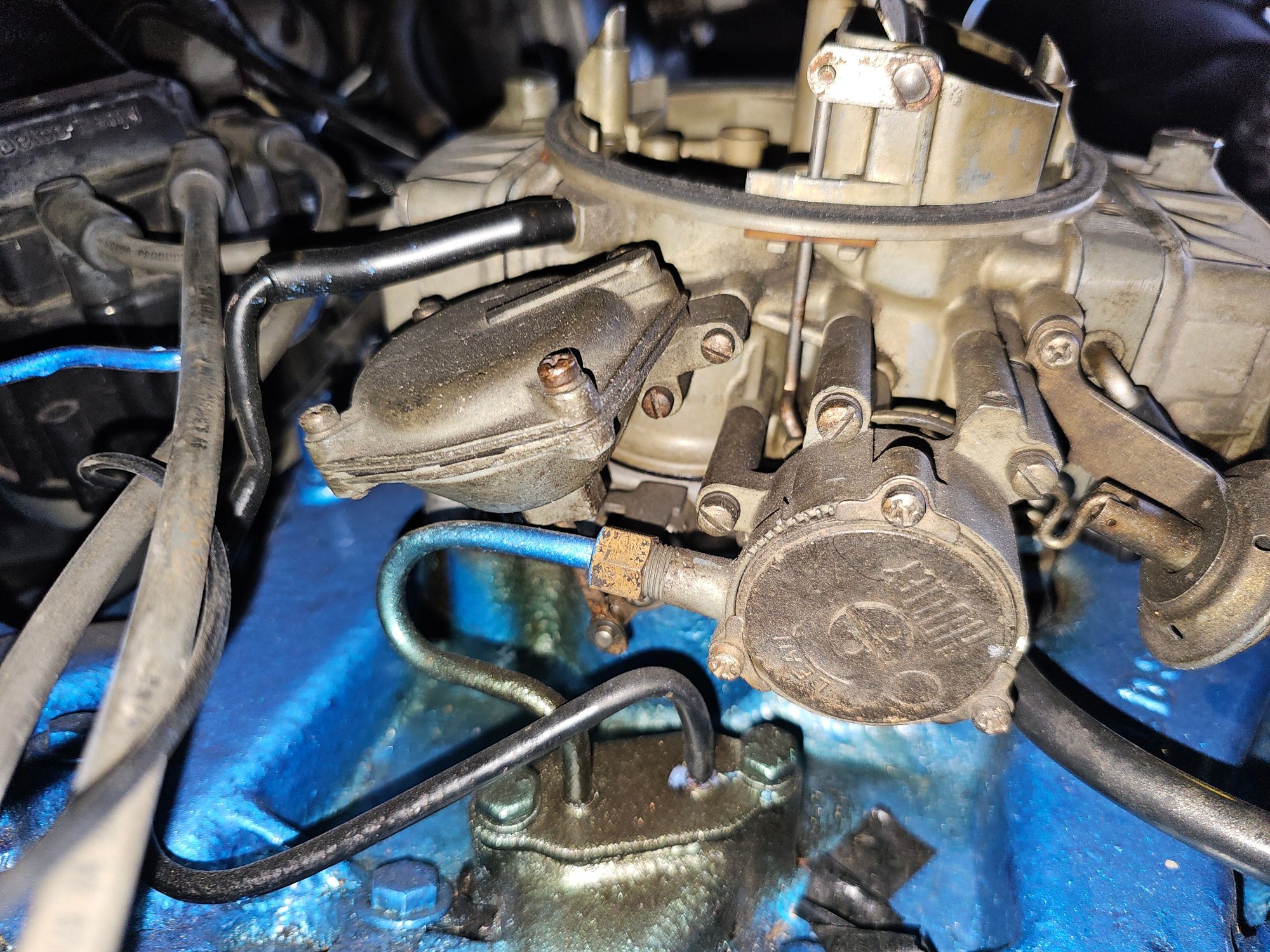 There's a Holly carb on there now. It's working the thing won't idle down correctly with an extra spring on the throttle linkage. I had a previous post about this to see if all these springs were correct (which they are not, but with just the double spring on the foot pedal linkage, it idles at 2000 rpm!!! Prior owner added a 3rd spring that pulls on the throttle to a point on the front of the engine. Rather than have the Holly rebuilt and fixed, I thought I'd try and get an original or a carb that would at least be a Quadrajet!