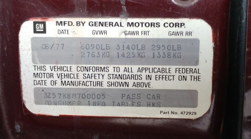 Here’s the sticker on my ‘78. It doesn’t have the same design, but it does have the same info. Another thing is that sometimes this sticker is removed when the car is repainted if they want to be thorough in the repaint. The shop might not realize that this sticker is important in identifying the car and that they should cover it up instead of removing it when painting the door edge.