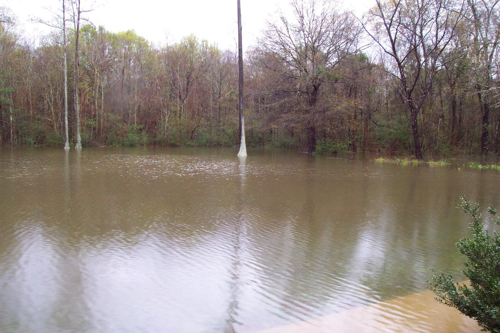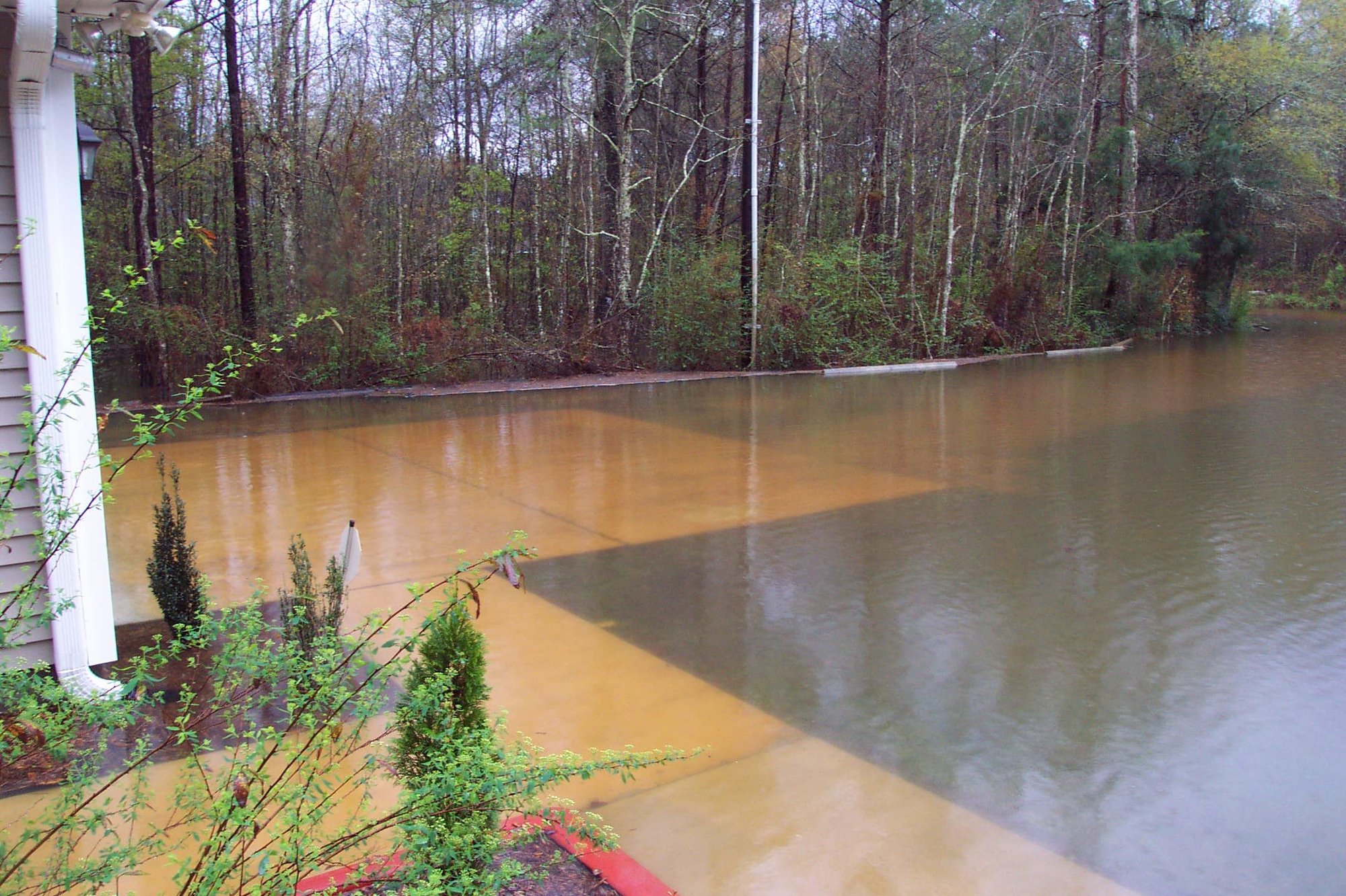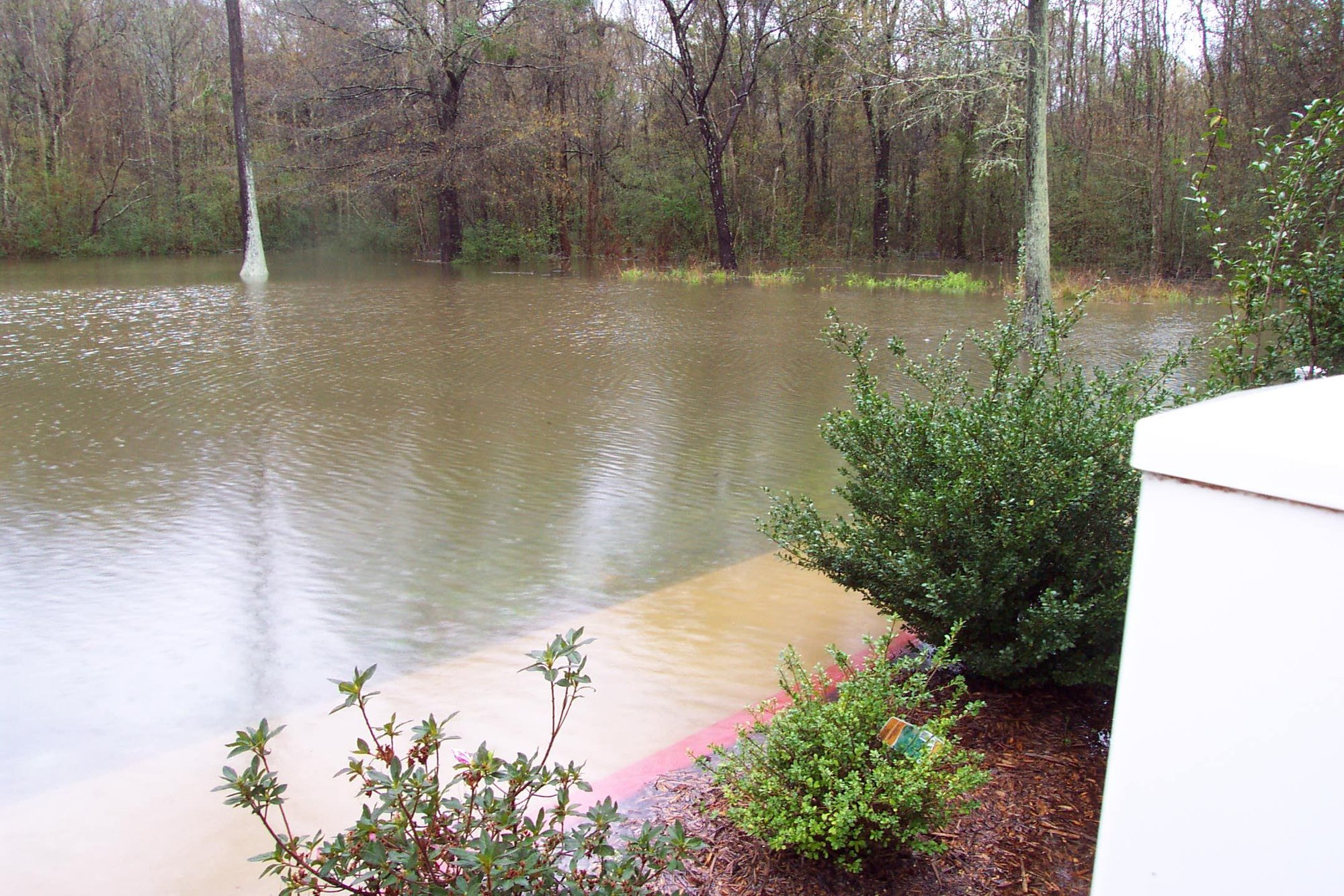 Back yard. Poor Mary has water up to her shins. There's a small bush beside the visible one beside Mary that is totally submerged.