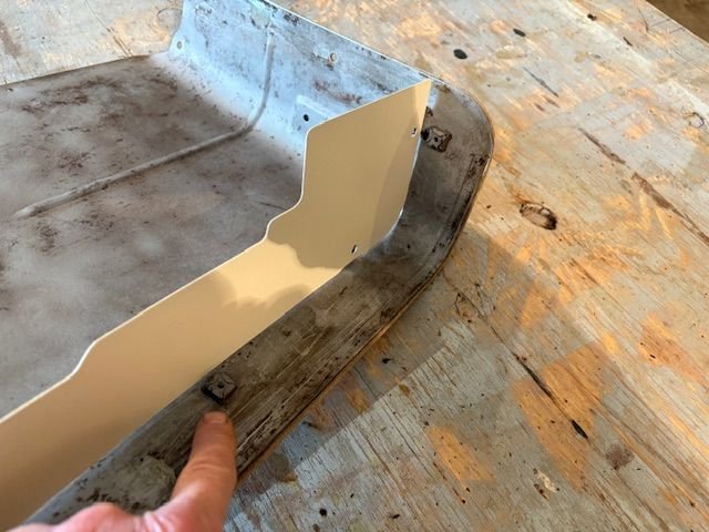 The white Sheetmetal piece at top of piston covers was cleaned up and repainted. Here my finger is pointing to a welded in place square nut, that I have no idea what purpose it is to serve. They make it hard for the new vinyl to go over this area, but that is how the old one was, so I kept them and covered them with new vinyl