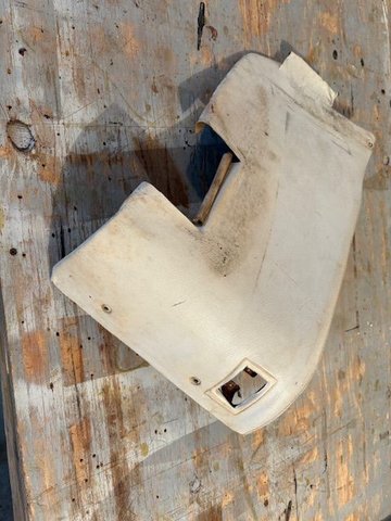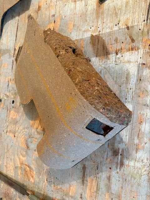 So when I bought this car in July, the interior was a disaster, really. What really looked bad were some cheesy loudspeakers that someone chopped into the lower front corners of the doors. I imagine great sound! But wow did it ever look bad. Last couple days I worked on the driver side. Again, this is a kit supplied by OPGI and made by PUI. I could have bought the complete panels by Legendary but cost was twice as much. This kit requires re use of several of the existing door components like the stainless steel trim elements, door lock grommet, door pull strap, and other things too. Biggest one is that the top rolled edge of the door panel substructure is a piece of curved steel, and that does not come in the kit. I had to destruct the old panel and salvage that part.