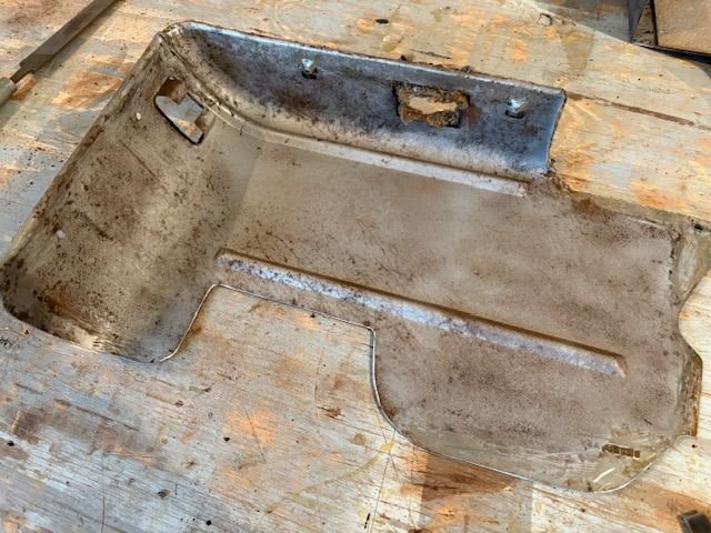 I started on rear seating area armrest/ashwell panels and piston cover panels, first photographing them and then tearing off old vinyl. These covers are bare steel Sheetmetal, I am guessing about 22 gauge? All had surface rust on backside. I cleaned off old glue and then blasted them. Did not prime them, as I didn’t want any issues with glue compatibility. PUI has a great 8 minute YouTube video showing covering an A body rear armrest. I followed that as my best practices. Best tips I learned, are that the surface areas are NOT glued, just the edges of fabric where it is adhered to back sides of Sheetmetal. Other tip is to use 3M rubber and vinyl adhesive. It is hard to find and 50 bucks a can.