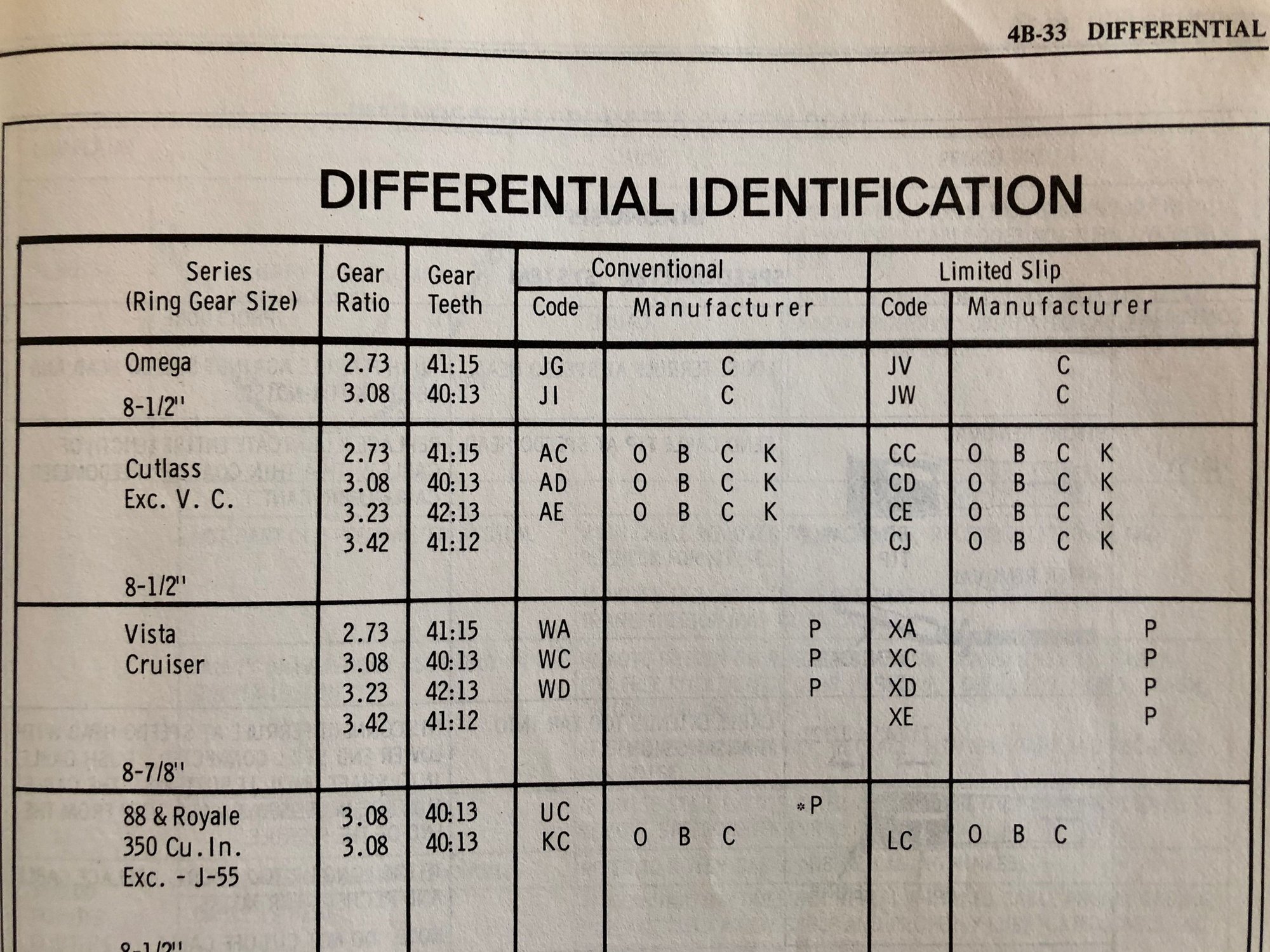 From the build sheet G90 3.08 RATIO AXL and according to the 1973 Oldsmobile Service Manual I would have expected the code JIC or JWC