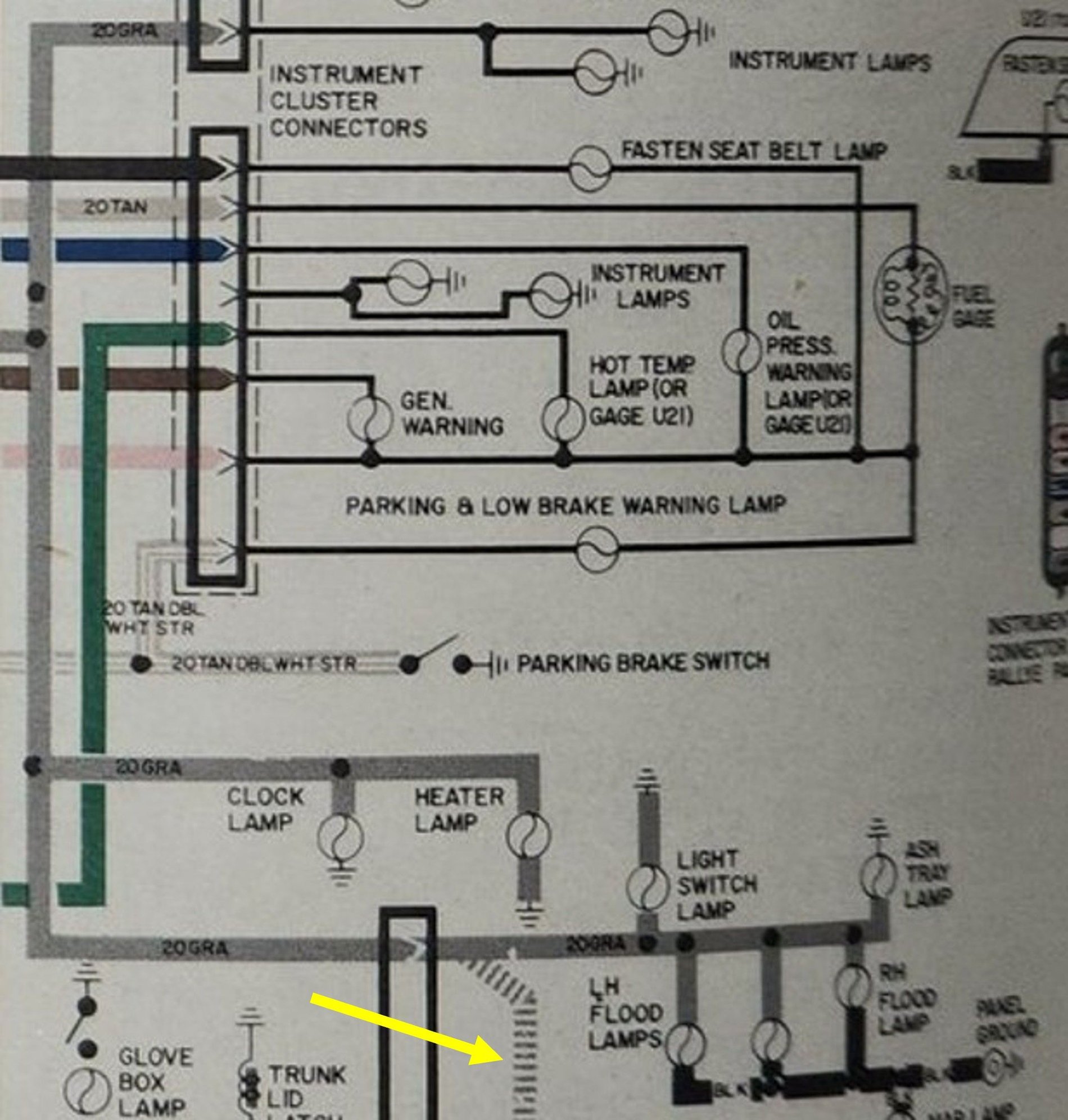 With that said, I'd approach the issue in a deductive manner - try to establish what already is "working". In wiring, it's helpful to write down your troubleshooting/diagnostics & of course, as you're doing labeling is vitally important. Identify which lights work & which lights do not work. I think that's your jumping off point. The remainder will hopefully become rudimentary. That yellow arrow and attendant wiring is not contained in the 1971 wiring diagram but is contained in the 1972 wiring diagram - thus, a departure to my familiarity. I "suspect" the broken/dashed gray line results from an add-on feature contained in some RPO lighting package as it's not "hard-wire" (so-to-speak) into the 1972 wiring diagram - likely came w/ some courtesy lamp illumination package or something? I don't know. Yet, find out what is working & what is not working along the gray wire & report back