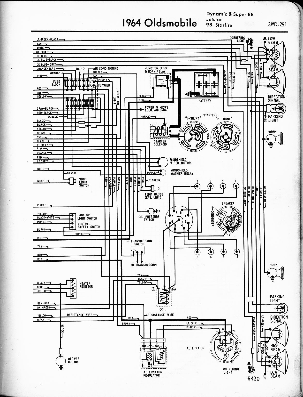 Thanks Joe- I have 4 of 5 volumes, but not volume 4, I think. I can't lay my hands on them this second so I could be wrong, but I know I have the engine manual, the transmission manual, the chassis manual and the body/sheet metal manual, and I think that's the 4 of 5 I have. The docs I found on line say 1964 Oldsmobile Dynamic and Super 88, Jetstar, 98 and Starfire, and they appear to be pages 3WD-290 and -291. There's a reference at the bottom of the page for PRINTED CIRCUIT DIAGRAMS page 3WD-408, and they appear to be straight out of the books- or at least, some book. Even the wire colors appear to be correct. They look to be pretty accurate, for what they are. Here's a link... https://www.oldcarmanualproject.com/...oogle_vignette