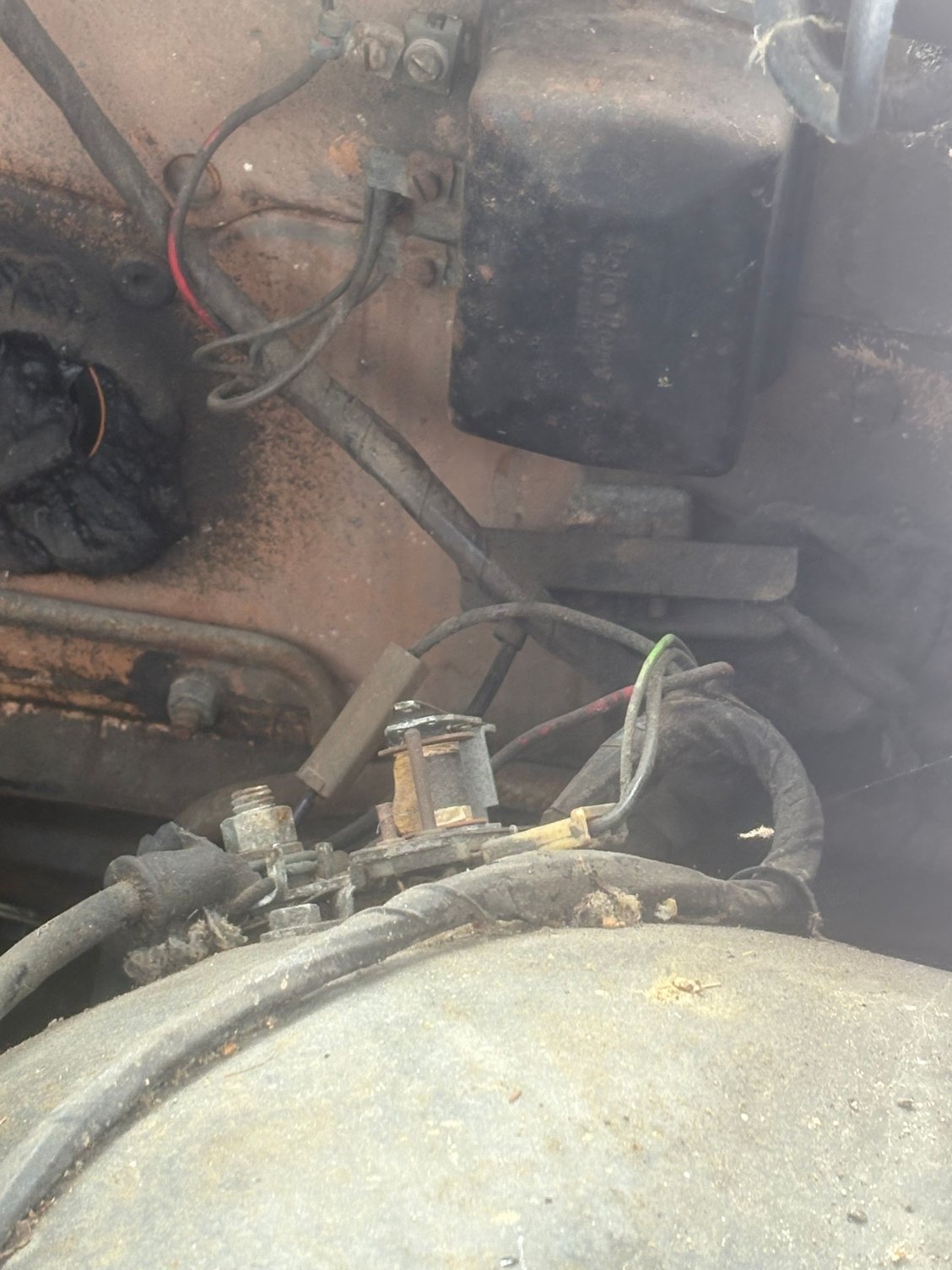 The 1958 Oldsmobile 98 uses a 12-volt, negative-ground electrical system. A large positive cable runs from the battery to the starter solenoid, while a ground strap connects the negative terminal to the engine block. The alternator/generator and lighting circuits connect through the regulator and starter relay.