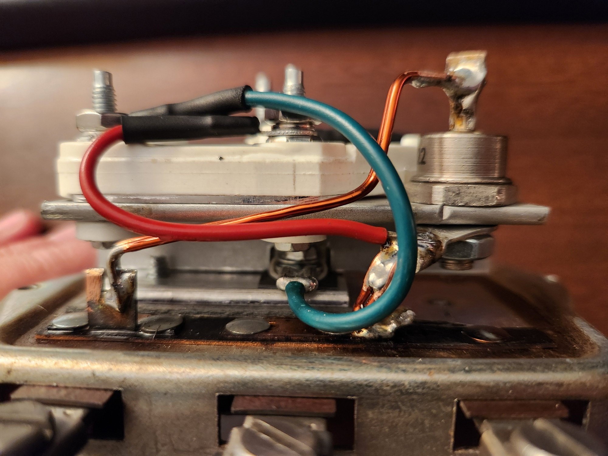Very interesting. It looks like it would be doable to reproduce that ss regulator.. I wish I had it in hand for a closer look. Pretty sure I see what it is doing. Would like to see how the base for the reg and diode is supported from the ground base of the regulator. The black wire is the reg ground to the OE reg base. I think the red wire becomes hot when the gen starts charging from residiual magnetism. . Blue wire is field. Diode serves as a cutout with feed for red wire on one side and battery feed on the other. Pretty sure the red and blue posts are using insulated screws to prevent them from touching the new diode and reg base. Gen/Arm wire is connected to the bottom of the diode.