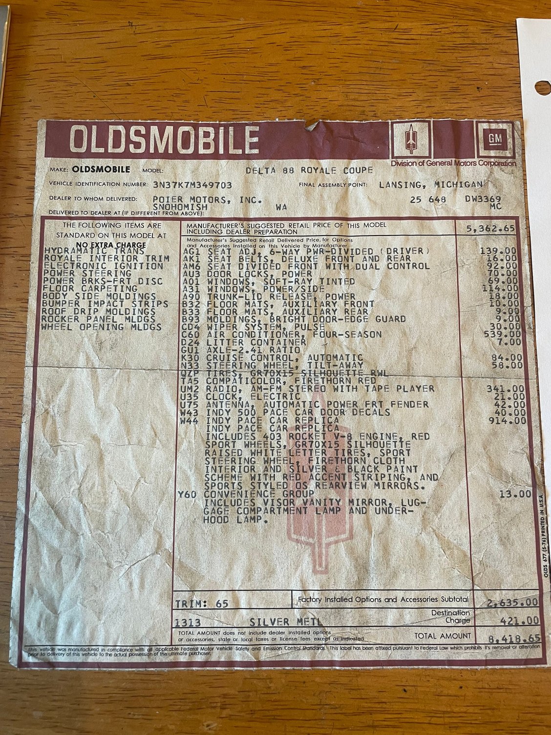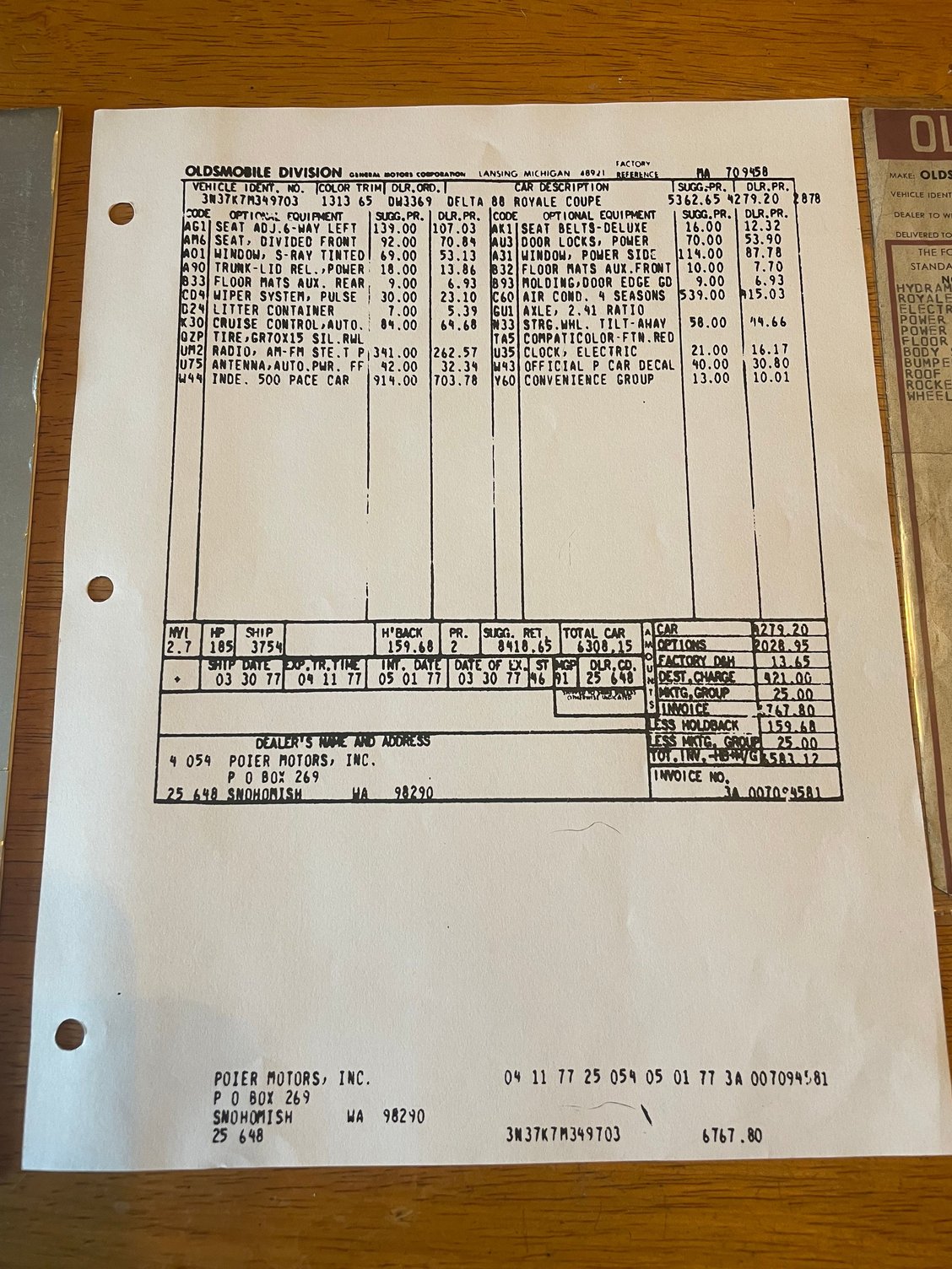 You would think, and I'm only speculating here, but it looks from the invoice and window sticker that the pace car options were just options like any other (power windows, air-conditioning, whatever), and records were not kept showing how may '77 Delta 88s had air-conditioning, power windows, or any other option. Perhaps the same is true for the pace car options. There may not be any other information or records out there to find. But, as I say, I'm just guessing.