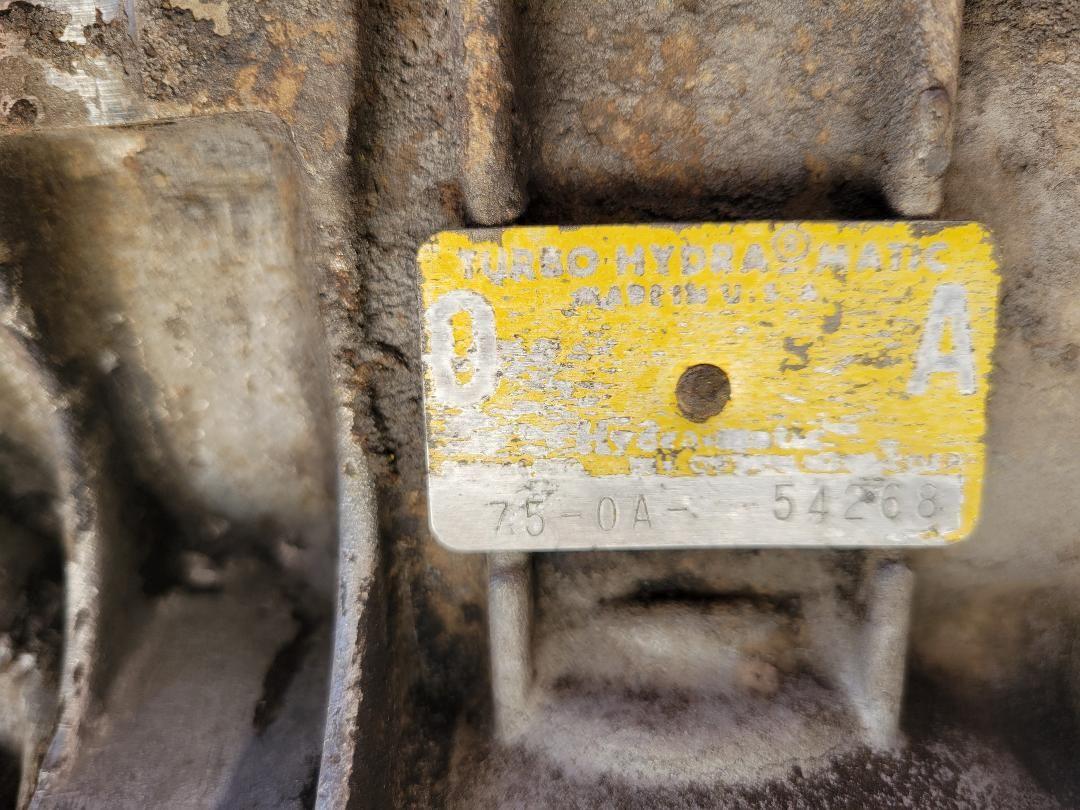 The trans is a 1975 OA trans. OA is usually a TH375, which is a light-duty version of the TH400 with a small diameter output shaft and long tail used only in small-block powered Delta 88s that year. Check the underside of the tailhousing, which will have 375THM cast into it. Not nearly as strong as a TH400, despite using the same case.