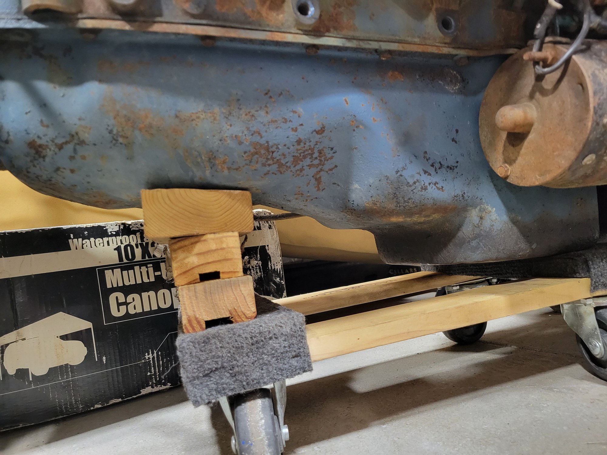 Mine is definitely 396021F casting on front by water pump. Would oil pan shape or exhaust manifolds help narrow down? The oil pan is like a two stage sump, with a mid level drop and then the big sump. See picture. The exhaust manifolds are number 1 and 13 ( I think, the 3 is tough to make out). The 13 passenger side is definitely strange shaped. I realize manifolds and oil pan could be changed out pretty easily. Thanks to all for the help.
