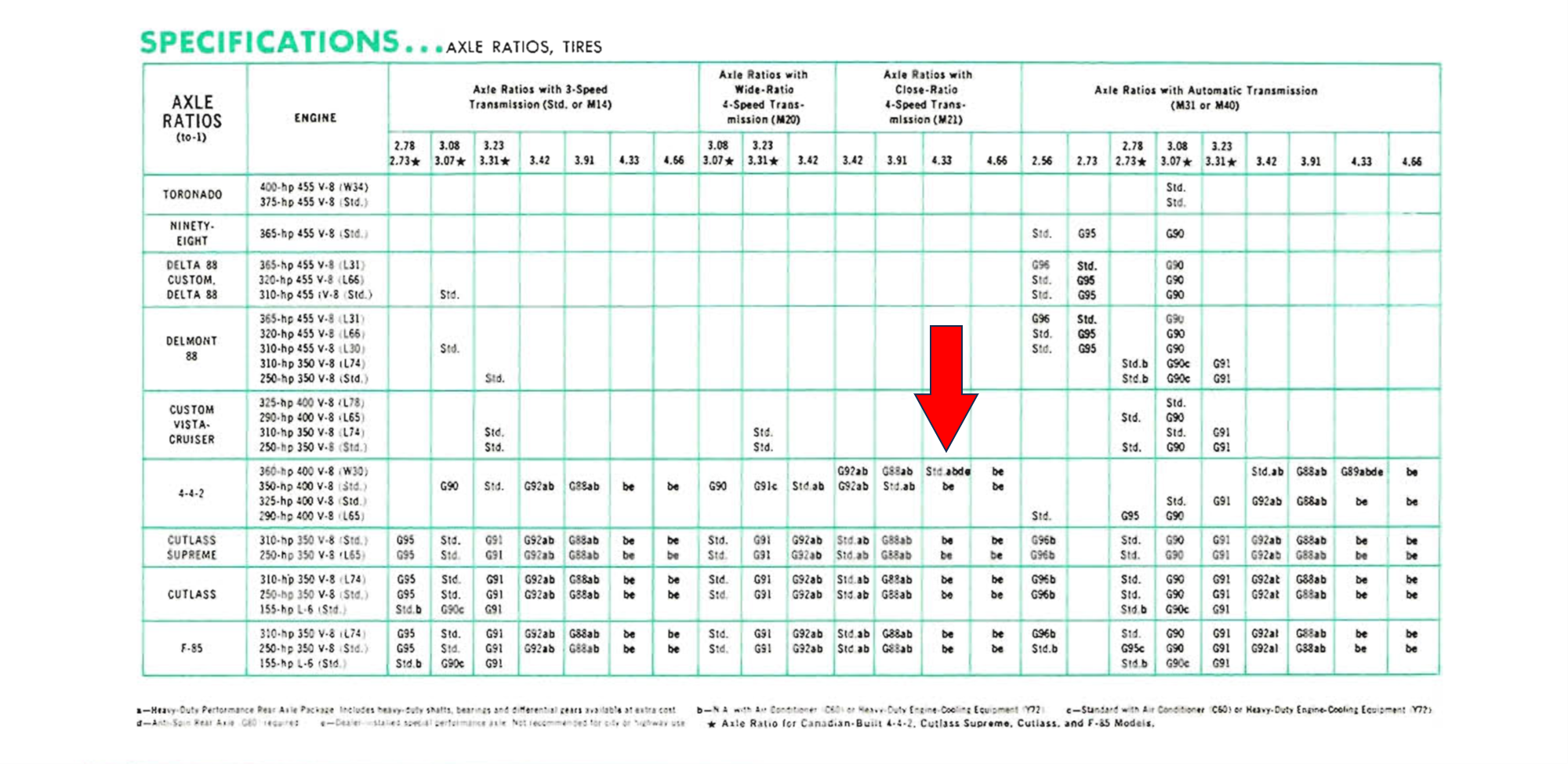 Interestingly on the 1968-69 cars, the 4.33 axle was actually standard equipment in the W30 and W31 with manual trans (note that the Ram Rod doesn't show up in this edition of the SPECS booklet).