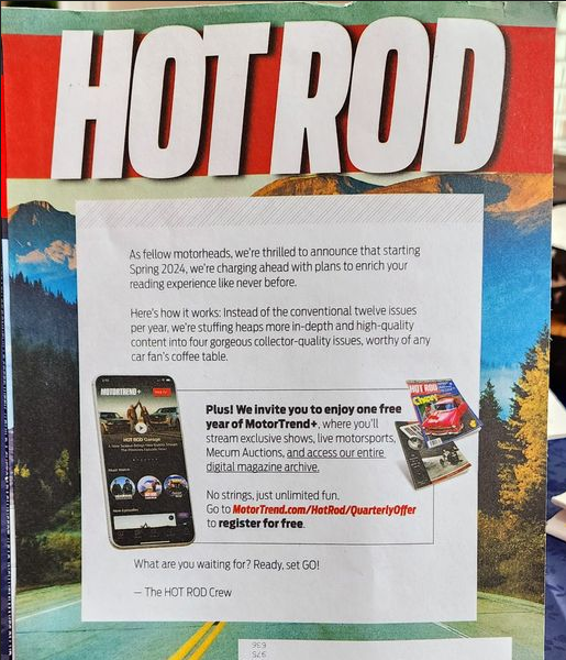 I just got the same notification from Motor Trend so I knew Hot Rod would do it too. No mention of any refund on my subscription for the 2/3 reduction. Crankshaft magazine does 4 issues a year but they are very nice.