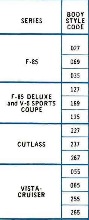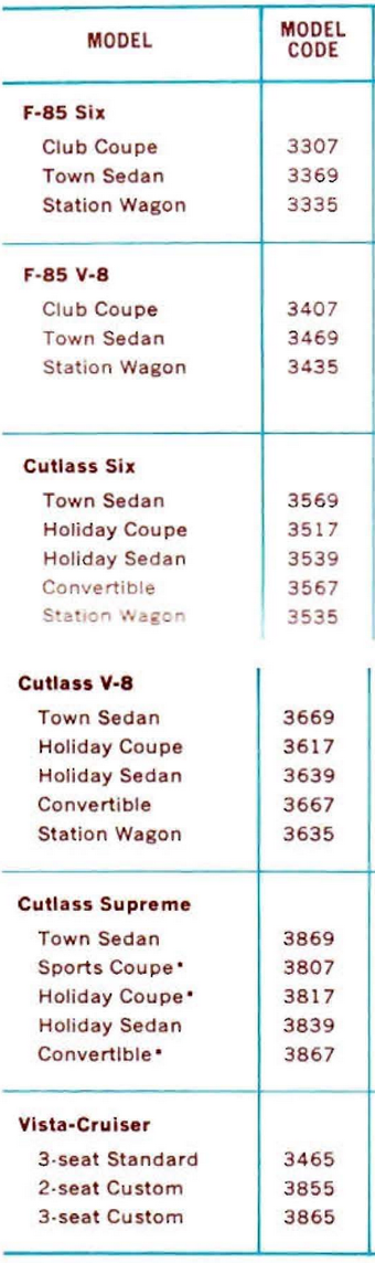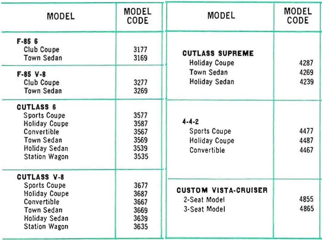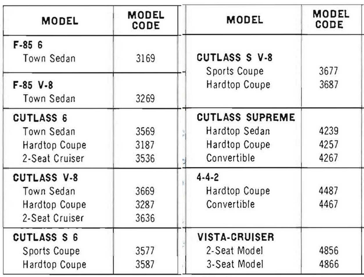 1968 continued with F85 (31xx/32xx), Cutlass (with or without "S") (35xx/36xx), and Supreme (42xx). Note that the "S" was only used to refer to 2 doors, the sans-"S" to 4 doors and wagons, but both retained the same model code 35xx/36xx, depending on I6 of V8. And note that this is the first time that the Vista also has it's own model line (same as the 442 that year) and the low-rent Vista was dropped.