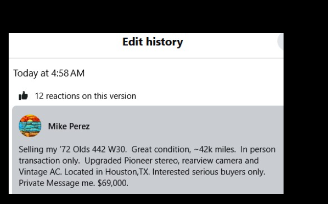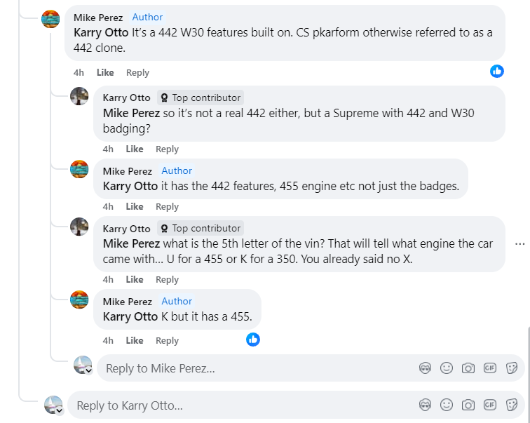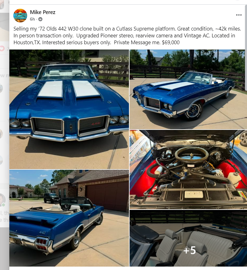 Observed this on the OCA facebook page today. It appears the controversy is settled now, with some good defending of honesty by members of OCA and here. What I have noticed is, as clones become more accepted and prevalent, that there are "soft attempts" by people to sell clones as the real thing. In this post, the seller put an ad up for a 442 W-30 convertible for $69k. He also advertised it on some other pages.
