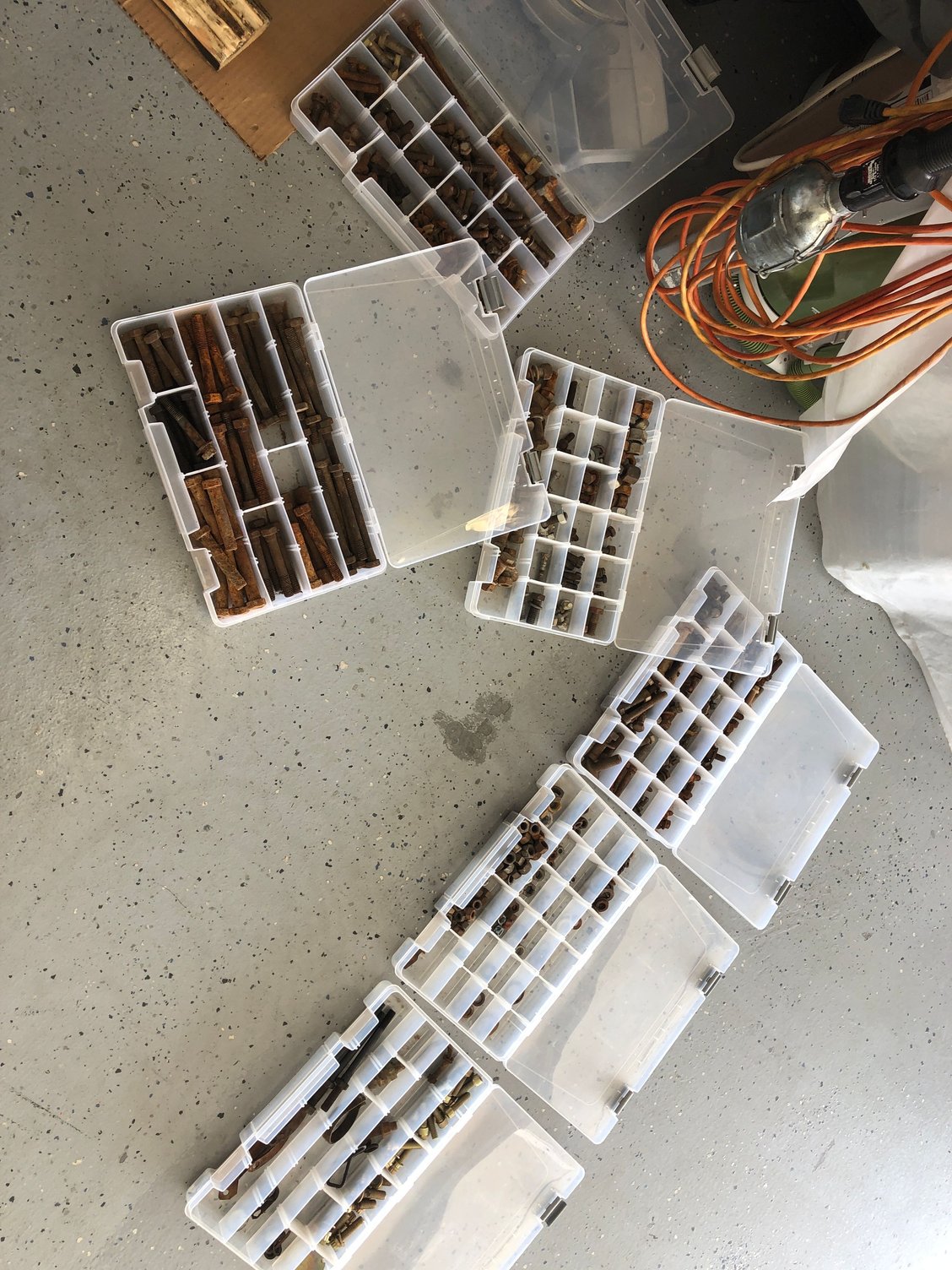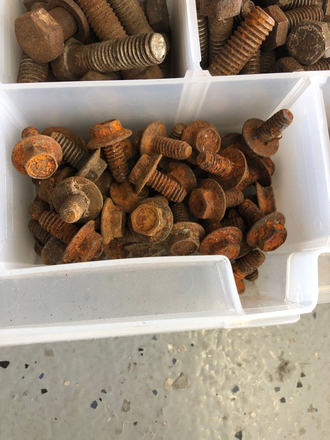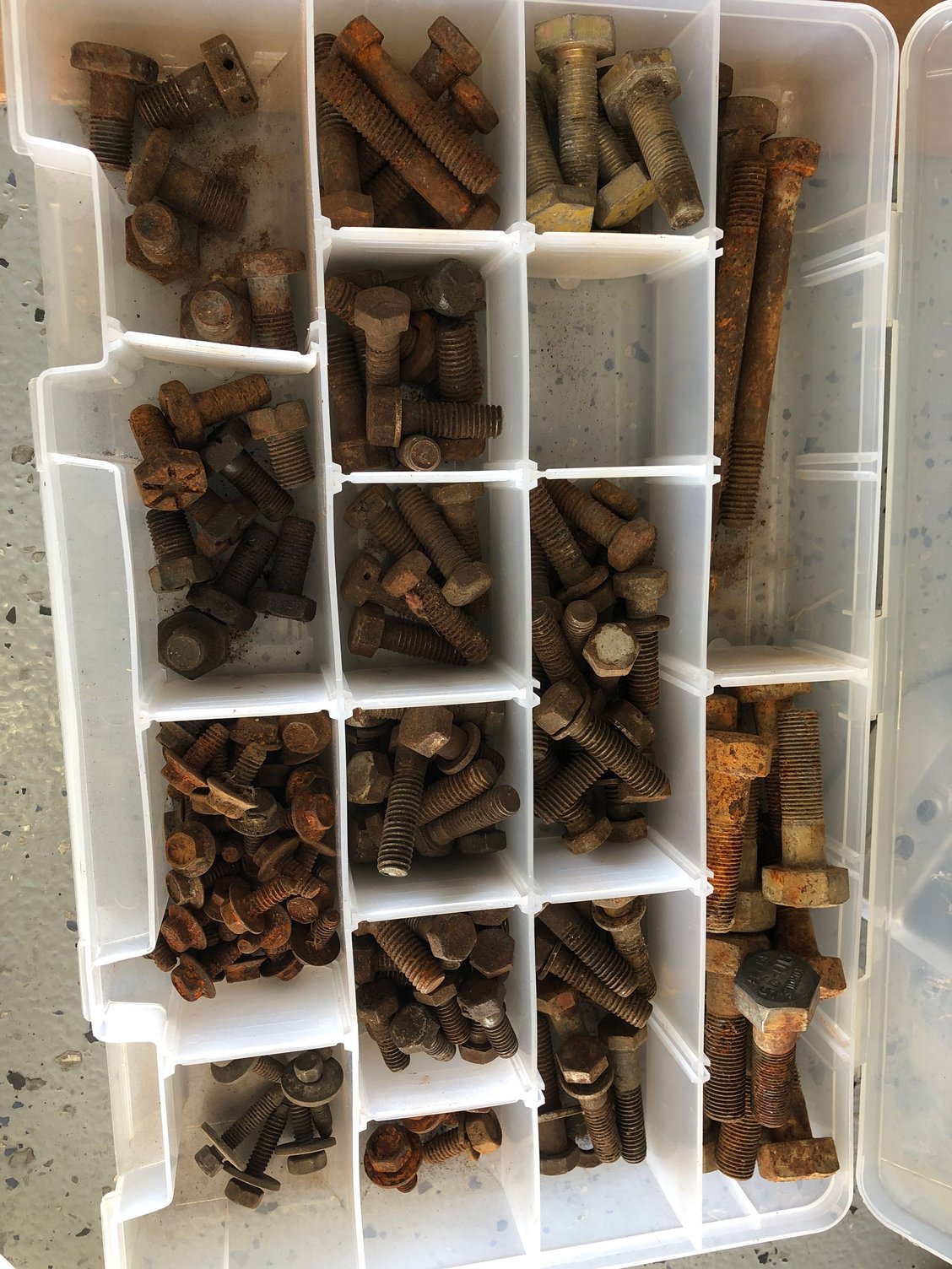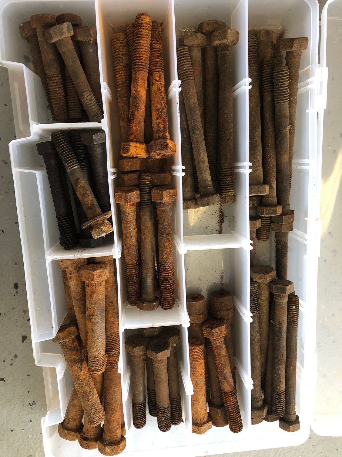 All my takeout bolts are thrown into a five-gallon bucket. I thought it was a big deal to sort the flat washers into one bucket, the lock washers into a bucket, and the nuts into another bucket.