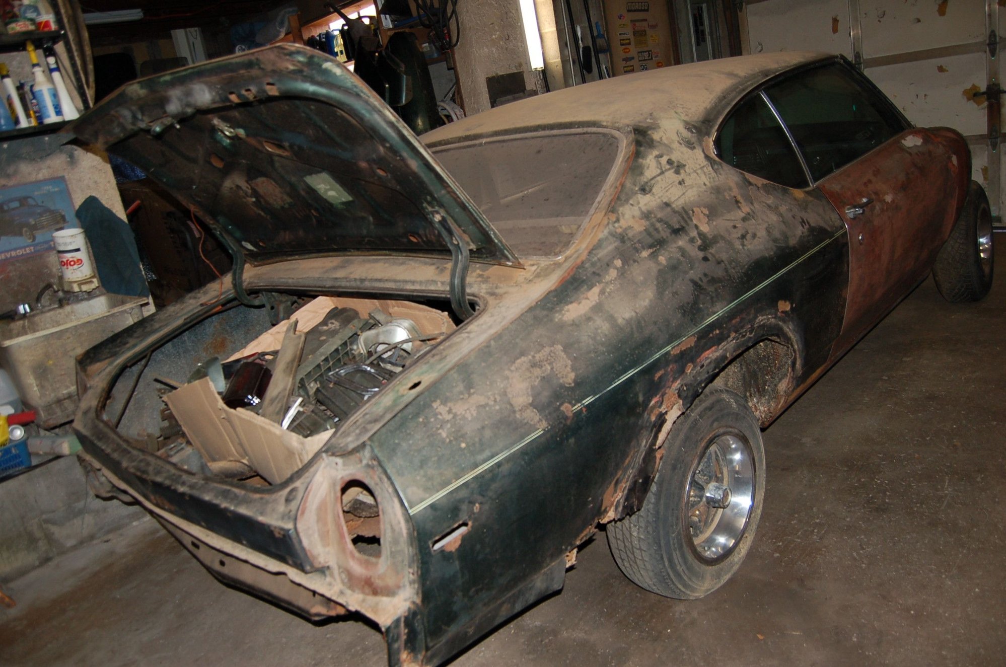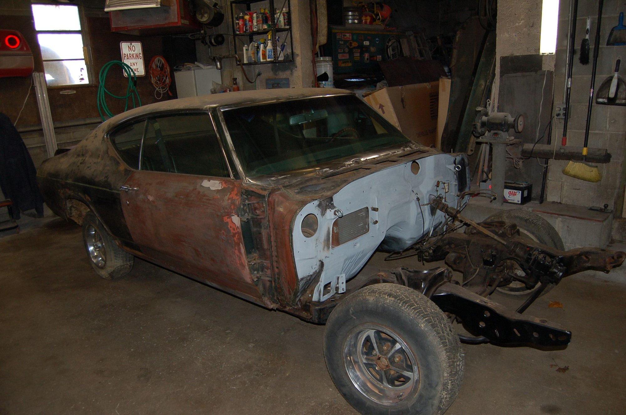 Like Joe said, the reason you see so many high end shops (Kendig, Ring Brothers, Roadster shop {yes they build cars too, not just frames}) start with what looks like a nice car to begin with is because metal work is expensive. In this case, the interior in the car probably cost $15K - $30K depending on the shop that did it. If the paint and body are as good as they look a shop probably charged the owner $50K +. Then there is the chrome, glass, weather strip, assembly, etc. It does look like it might have a mustang II style front susspension already. I can see $120K spent to build that car if a shop did it all. The current owner probably spent a fraction of that when he bought the car. You guys might like the nostalgia of the IL6, but it really holds the car back from a value stand point. I agree that the car should get a Roadster shop or similar type frame along with the LS3. if the current owner really wants a 52, starting with a ruff car would cost more in the long run (assuming the current car was bought at a good price). Here is a real world example of this: About 10 years ago my brother and I restored a 69 Chevelle for a local guy who happened to stop by my brother's garage one day. He had all new sheet metal for the car and had the motor built by a shop he used for his circle track car. He had a friend with a local high end shop who quoted him $100K and at least 1 year wait before they could even touch the car (this was in 2011). Remember that was without any motor, trans, or rear end work. This was a stock type restoration so nothing fancy in the way of modifications. For reference here are some before and after pics. We back halfed the car (one piece trunk, full quarters, outer wheel wells, rear panel, trunk lid) along with full body, paint, interior and assembly.