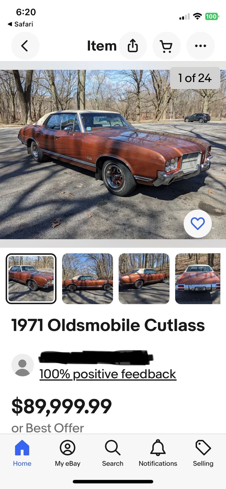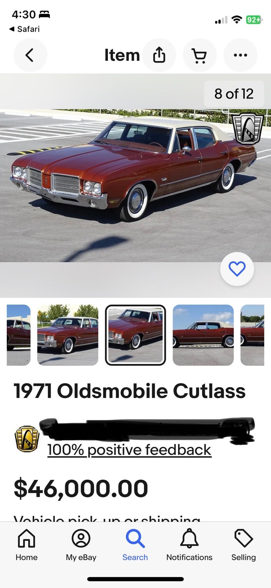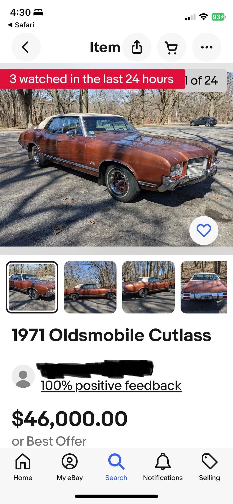 Pics are my two Cutlasses & 3x evidence of market obscenity. 71 Cutlass S & 71 Cutlass Supreme hardtop sedan I need evidence this car is famous for this asking price. Copycat with a daily driver Apparently asking $46k was too low, so they’re fishing for elite buyers
