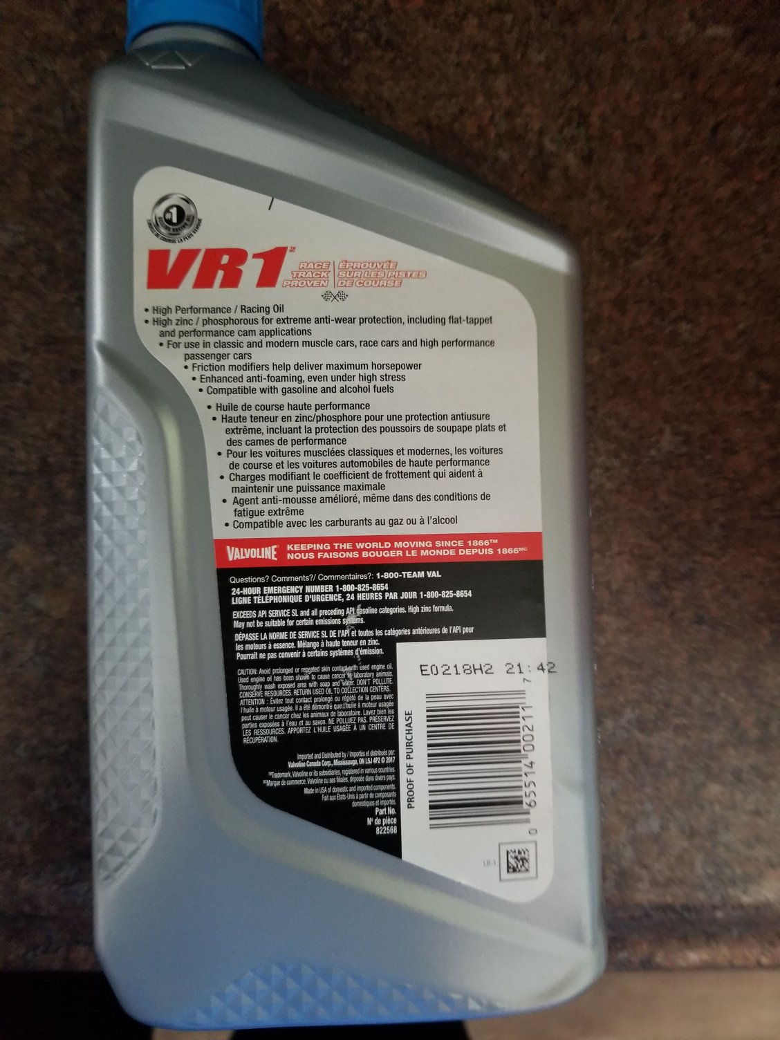 [QUOTE=olds 307 and 403;1148674]I bought the 20W50 VR1 at Walmart in Yorkton, Saskatchewan for $7.97 a liter. They have both SN rated, supposedly still has high ZDDP due to being a 50W oil and the unrated 20W50, which I bought.
