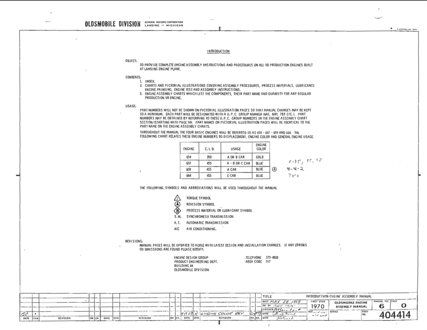 ;From what I was able to determine, 654 = 350ci block, 657 & 664 = 455ci block, & 658 = 400ci block. Depending upon valve timing and the camshaft for each application, those items will determine the horsepower output of that particular block. I take it you are referring to manual section 6-0, page 100, of the assembly manual, as well as possibly manual section 6-1, pages 103 & 104.