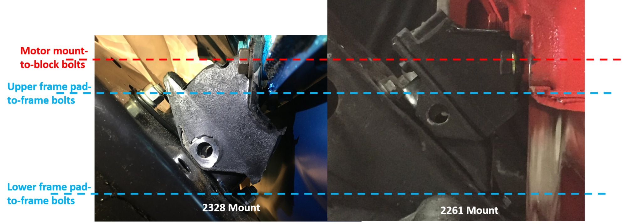 What I find really interesting is that the 2328s wrap under the oil pan rail, whereas the 2261s are completely outboard of the rail. That suggests that using 2328s and matching frame pads on an SBO might free up room for headers.