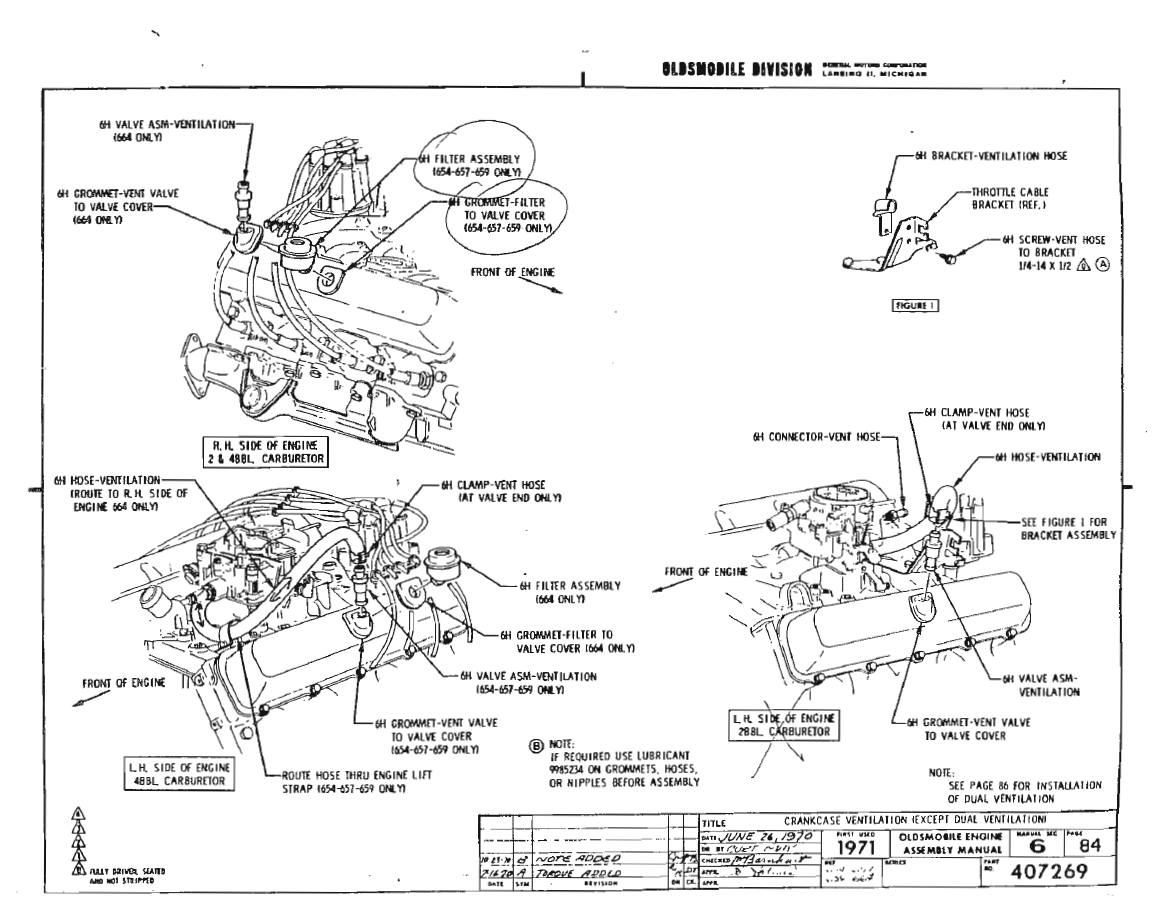 As for what's correct for a 1971 442, how about we go to the factory PIM instead of random photos on the interwebs? Note that on this drawing, the 664 engine is the Toronado. All others have the PCV on the driver side and the breather on the passenger side. If the clown who owns the car in the second photo had installed the valve covers correctly, that car would also have been correct. Also note that the car in your first photo has the incorrect PCV valve.