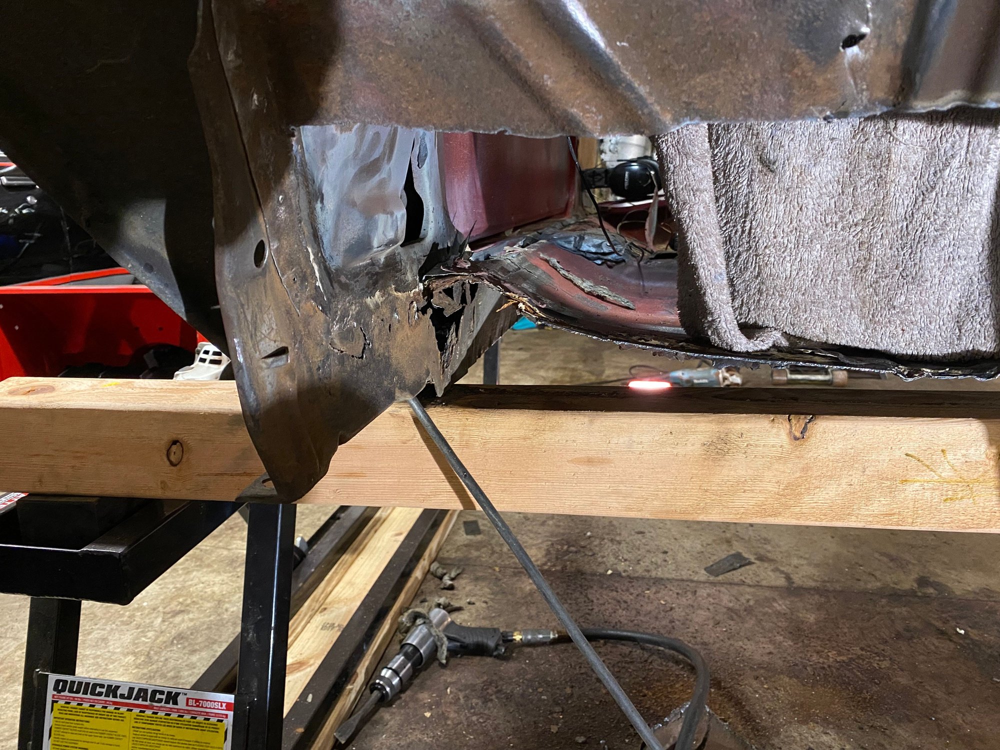 Got the frame scooted out from under the body with some ingenuity. I have Quickjacks (basically hydraulic 2-piece scissor lifts), and used 2 4x4x8 posts, one near the firewall, the other at the back of the pinch weld, plus a jack under the trunk where the gas tank would be (mostly for stability) to raise the body to the full 2nd position. Then, I disconnected everything and pushed the old, damaged frame out!