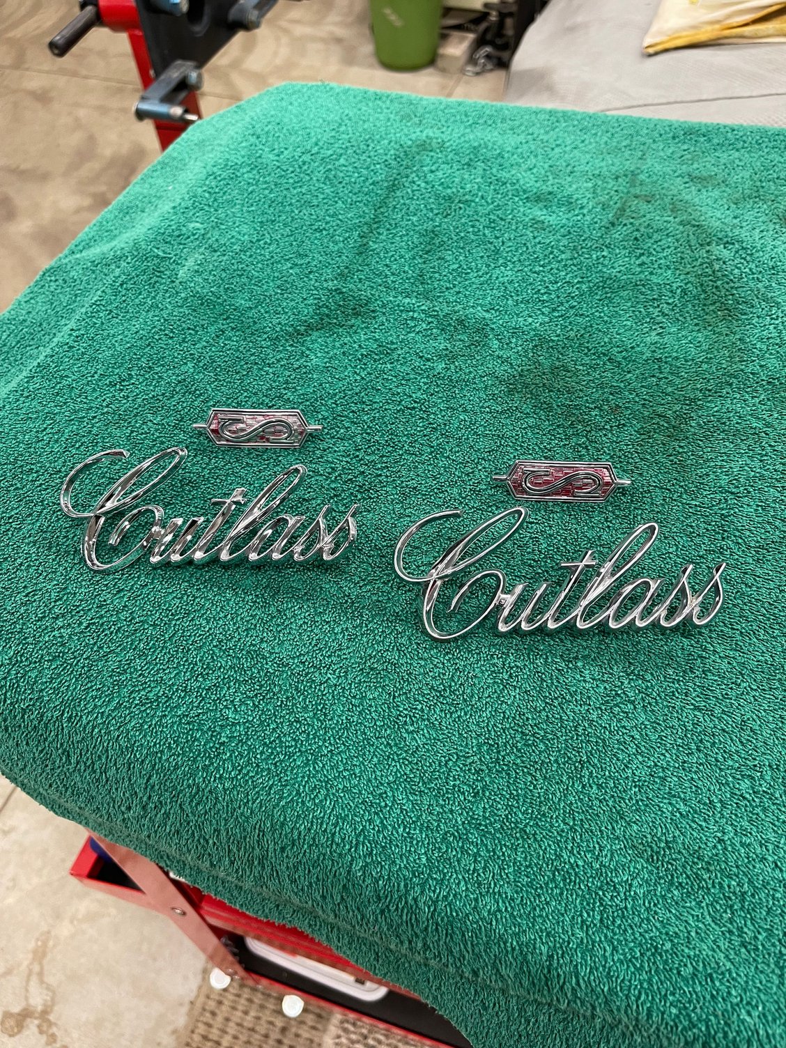 One Cutlass emblem is original to the car, the other is a replacement. Can you tell which is which?
