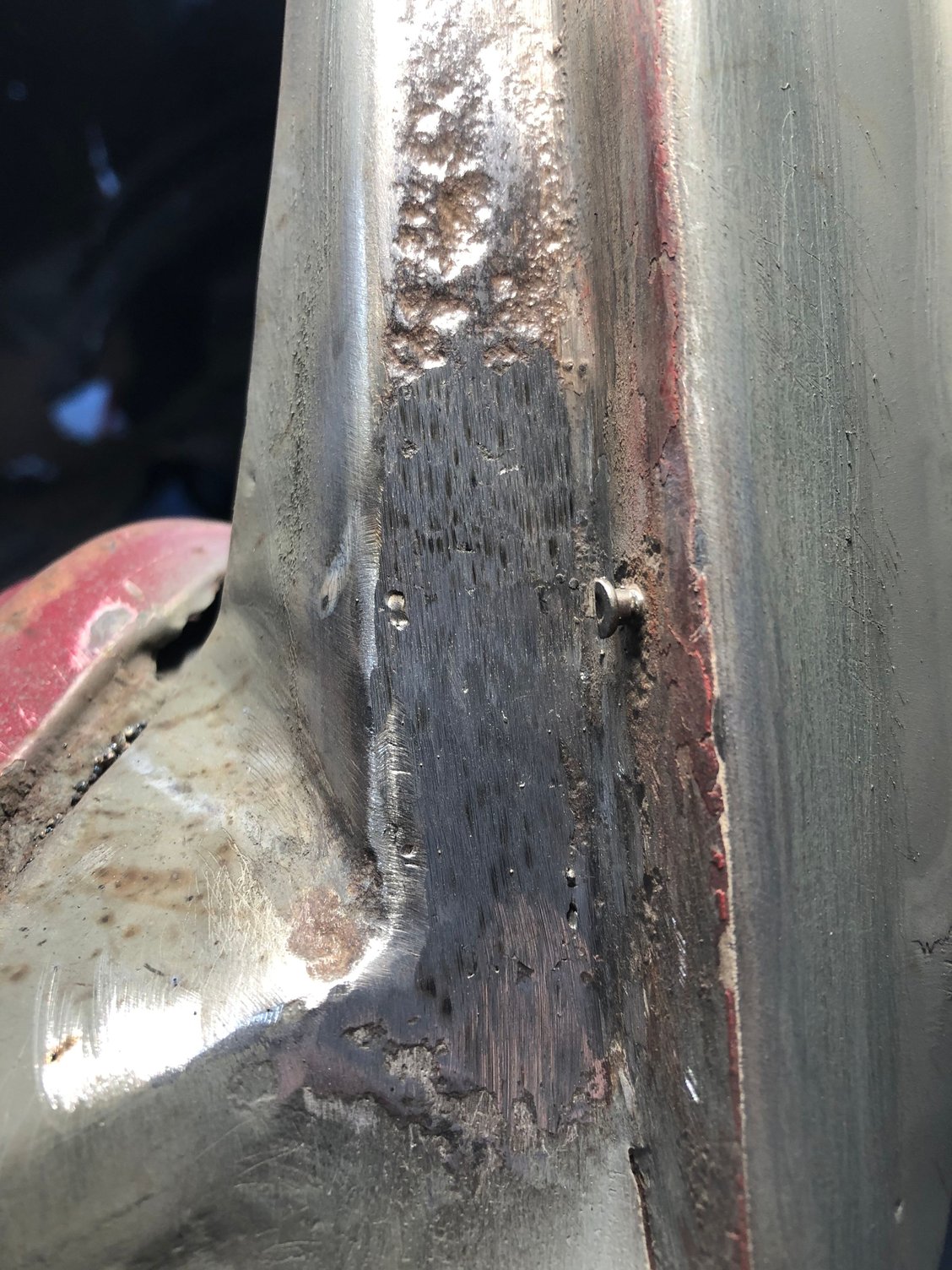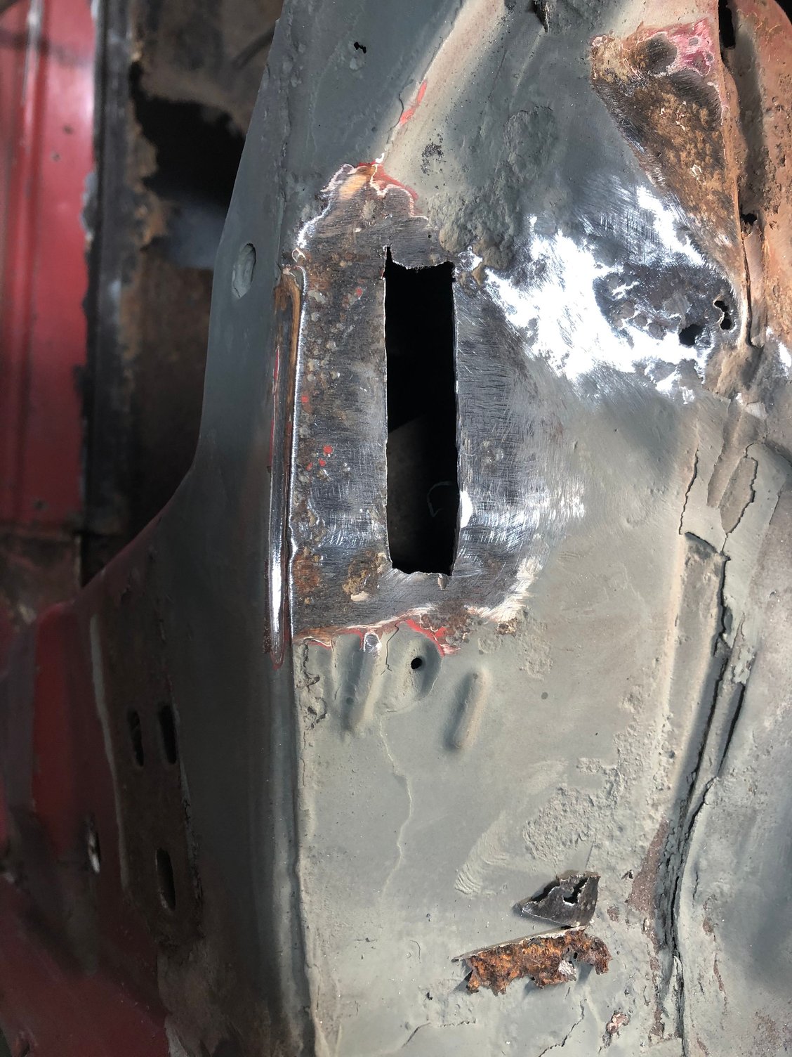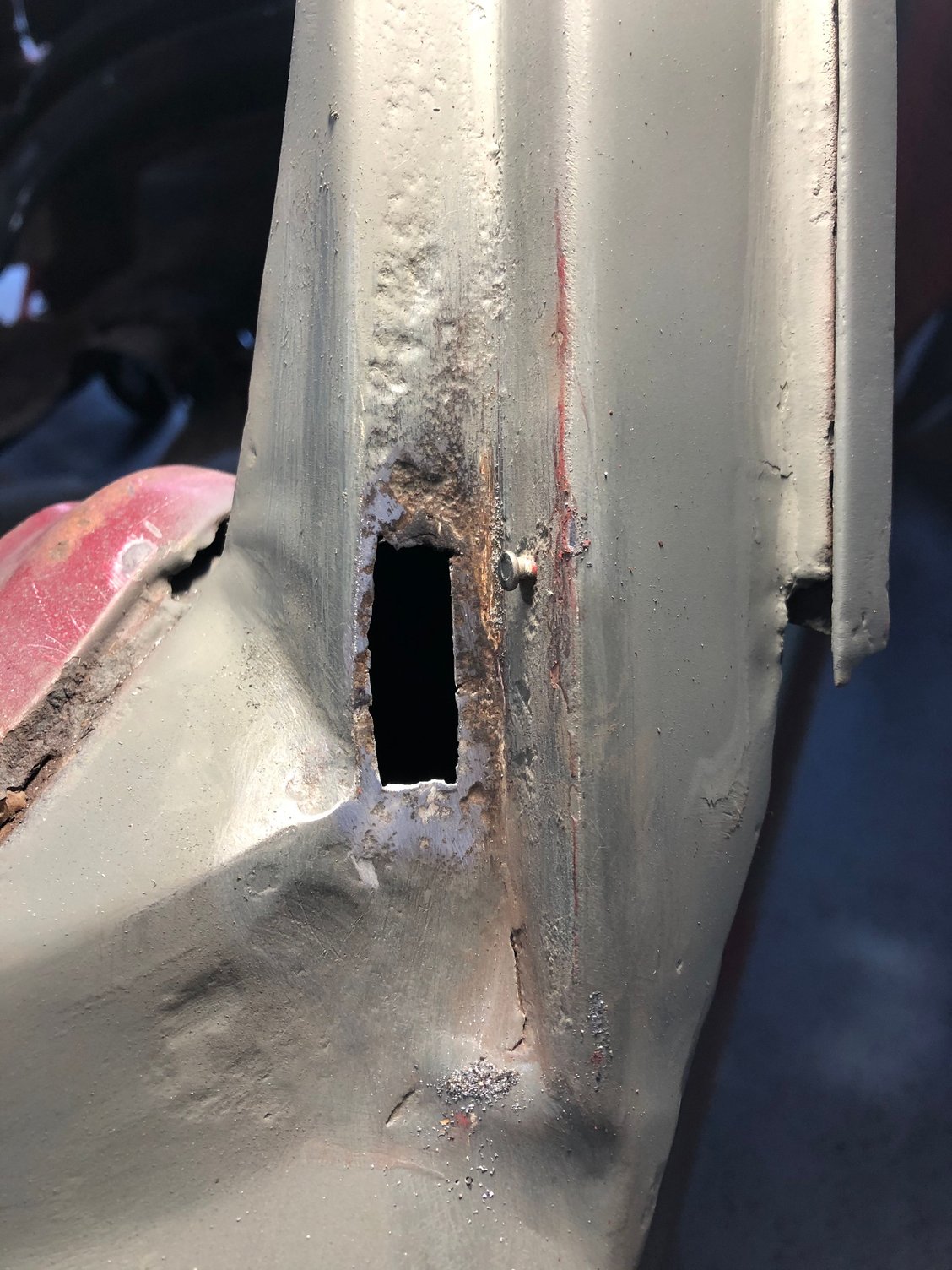 Eddie, I haven’t had time to get on fab In the inner brace, kind of dreading it actually. I have been busy doing other tedious work that needs done and small holes that need patching. Finished the roof Found some rot in the a pillar that needed fixed. Done, a little filler to smooth it out but turned out good I think and it was easier than I thought being that tight.
