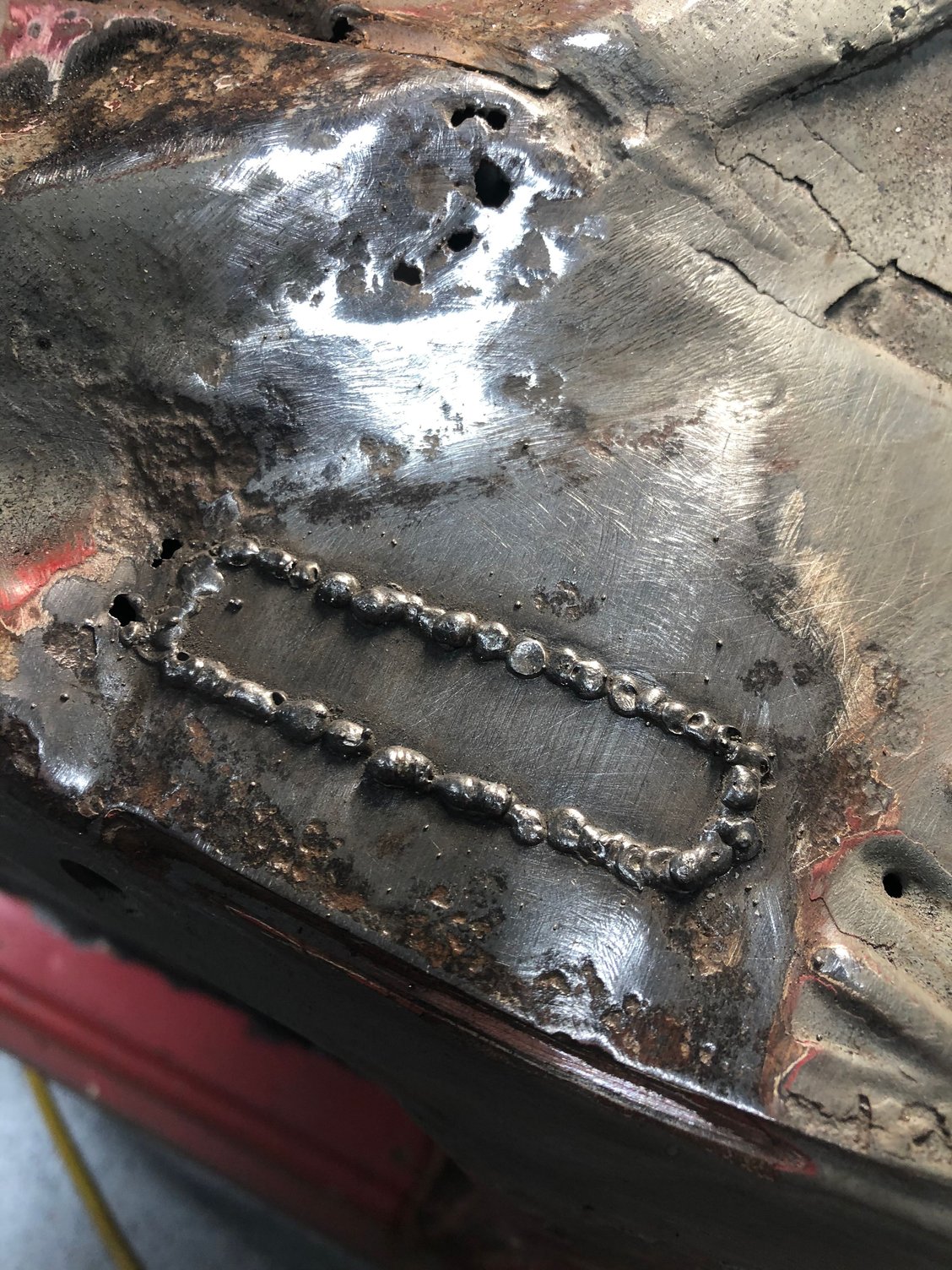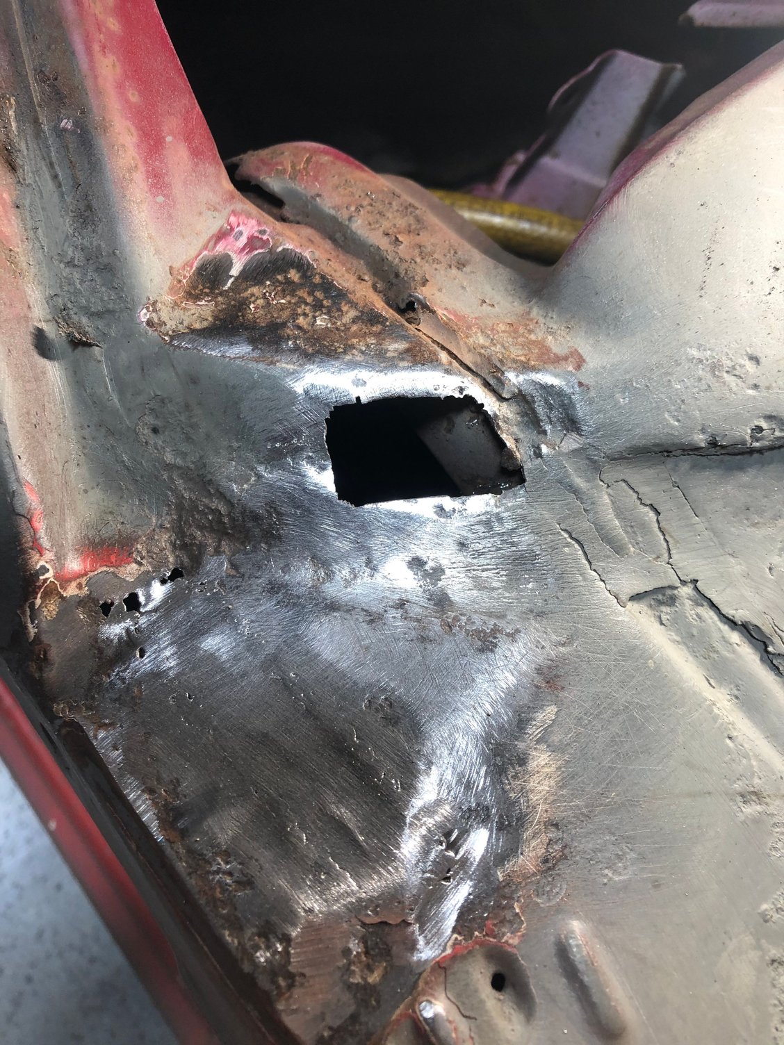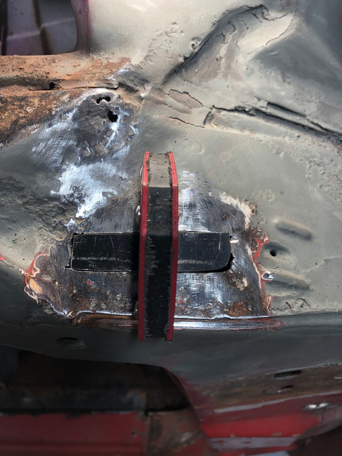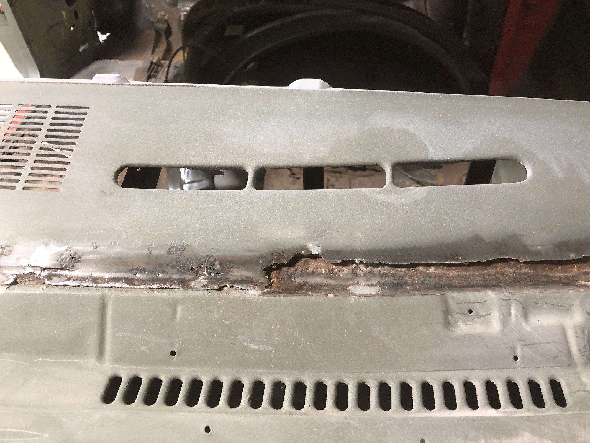 Eddie, I haven’t had time to get on fab In the inner brace, kind of dreading it actually. I have been busy doing other tedious work that needs done and small holes that need patching. Finished the roof Found some rot in the a pillar that needed fixed. Done, a little filler to smooth it out but turned out good I think and it was easier than I thought being that tight.