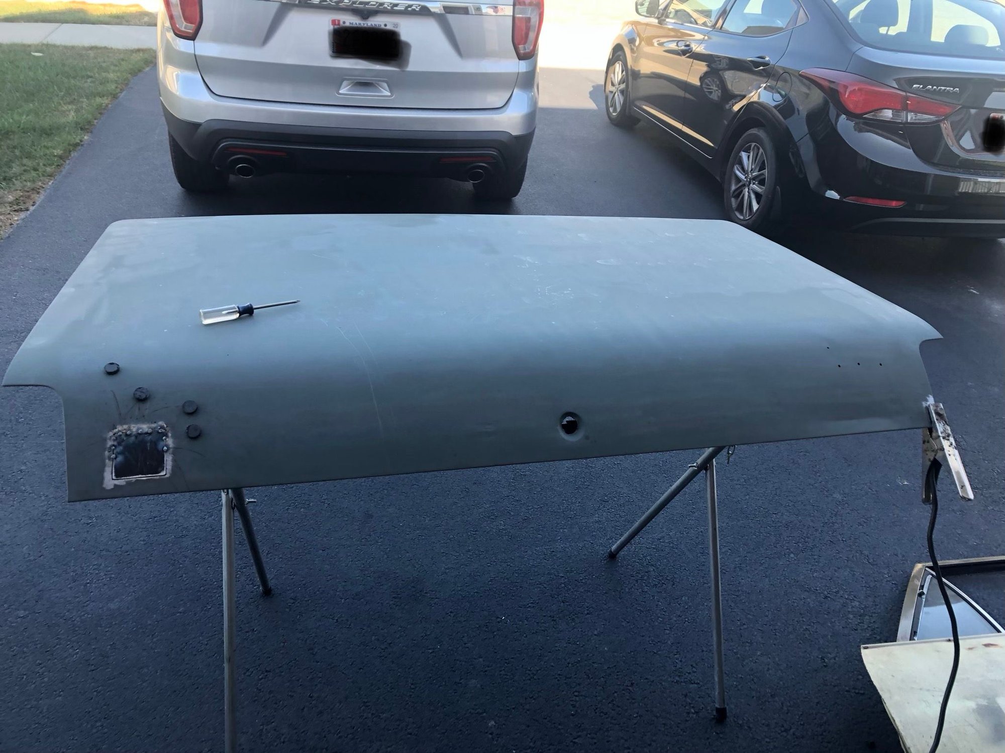 Trying to replace the little holes all around the dash/firewall/a pillar. New piece in and sanded some, now to the next one. Started sanding the body down to bare metal and primed to keep the rust away on the east coast. Limited time when I got to get my girl from the bus.