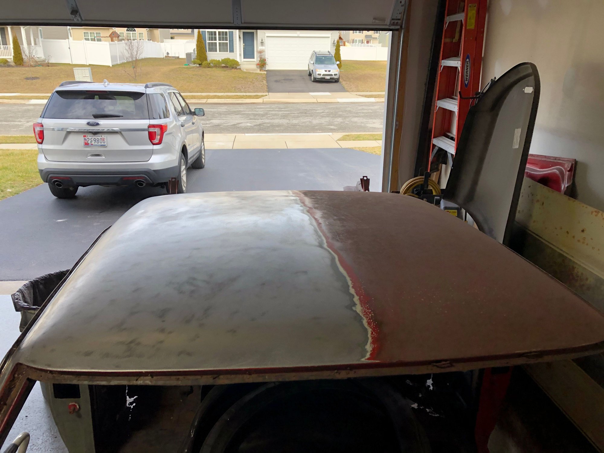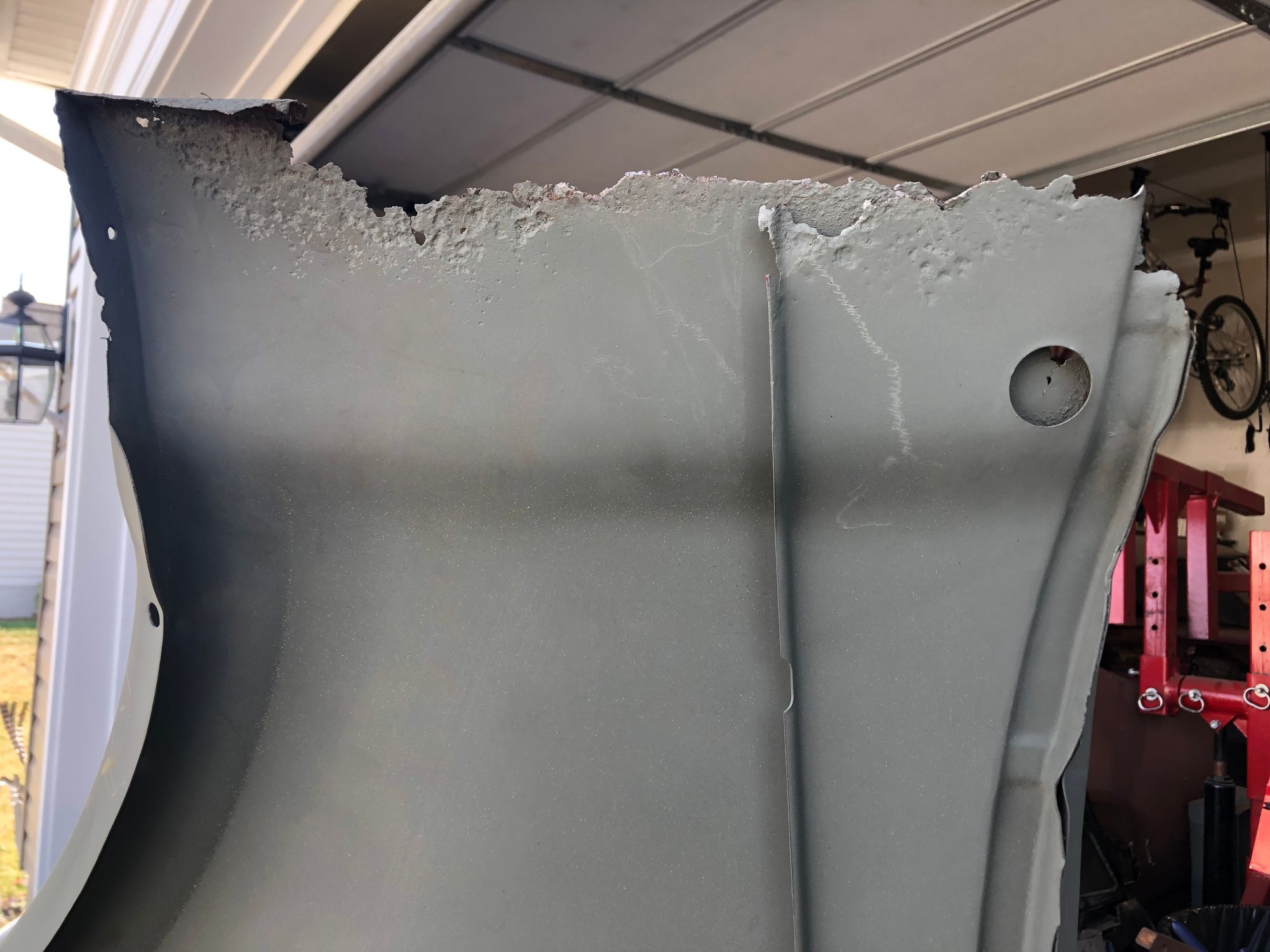 Getting things done with this nice warm weather we are having on the East coast!!! Slowly but surely it will get done. This has been 10 years in the making getting to work everyday on my dream!!!! Under that bondo was this monstrosity!!! Didn’t even fill the hole with metal. Just put bondo right over them. Front to rear view How far back the dent went from with they tried to fix the rot before I got the car. More sanding to get to bare metal, passenger roof today, did find two small dents but not deep or major. Primed and waiting for the other side to get done maybe tomorrow!!!