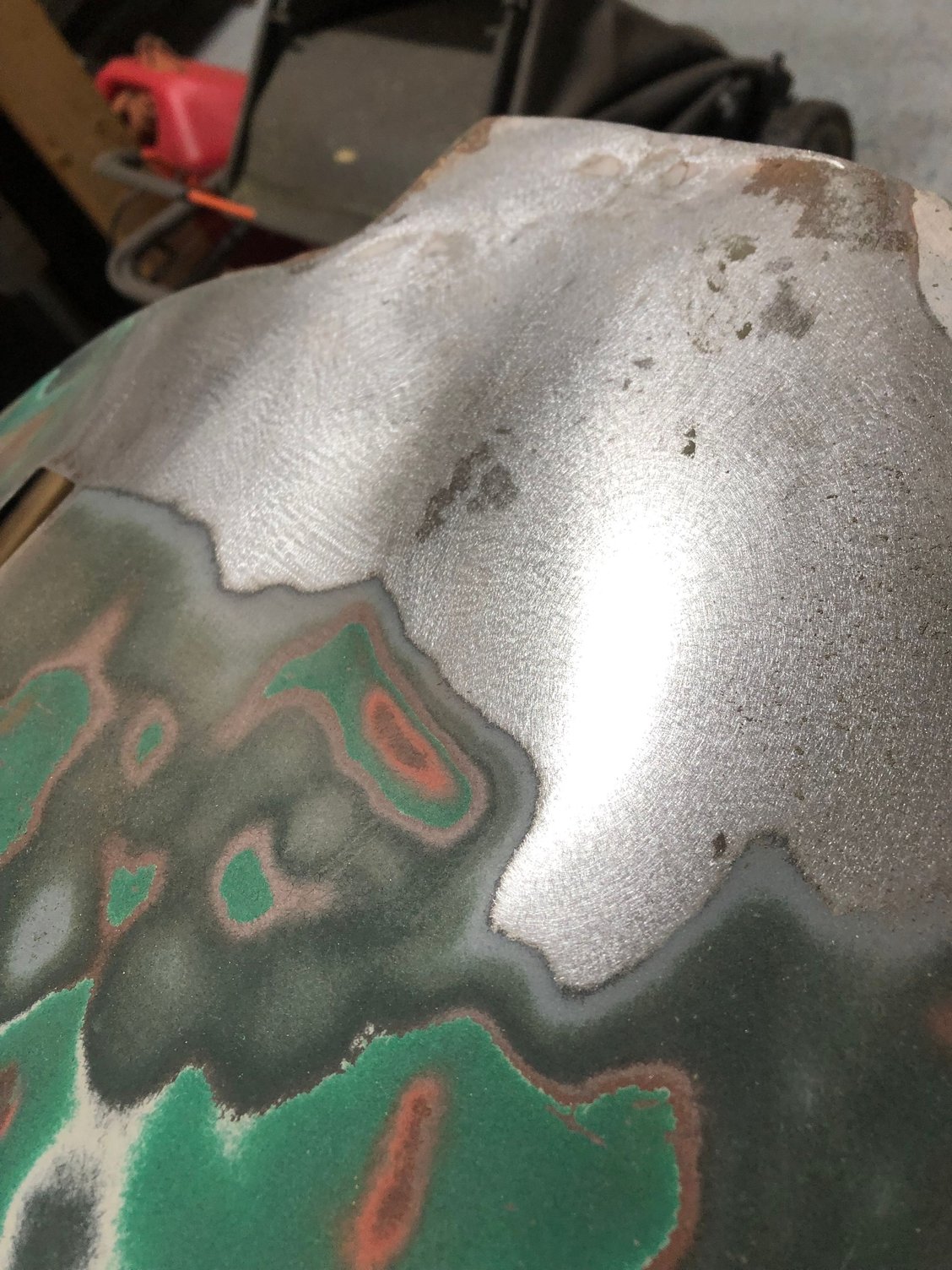 An update from the last couple days of light work on the drivers side fender. Found a nice dent and a few spots of bondo that were covering some quick fixes. I also found that this fender has been painted 3 different times!!