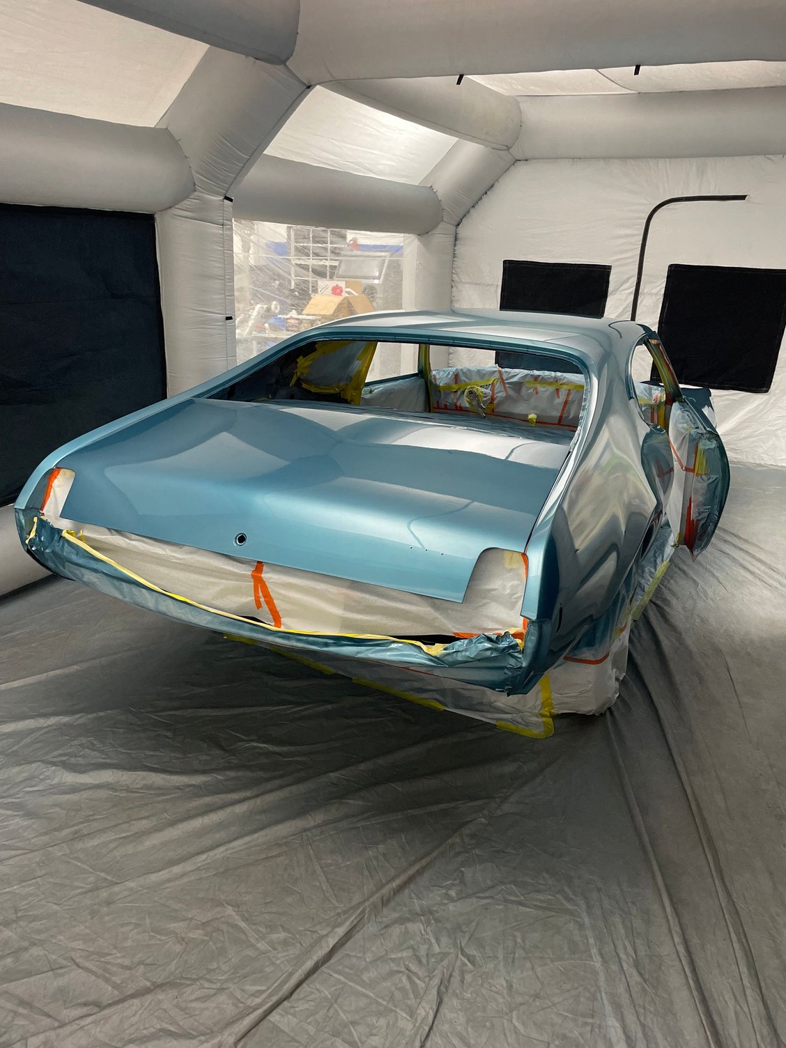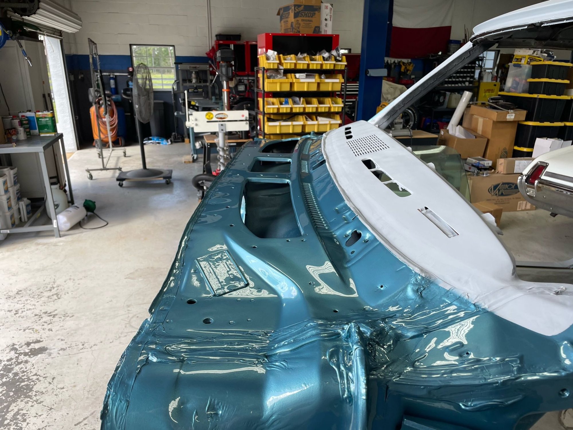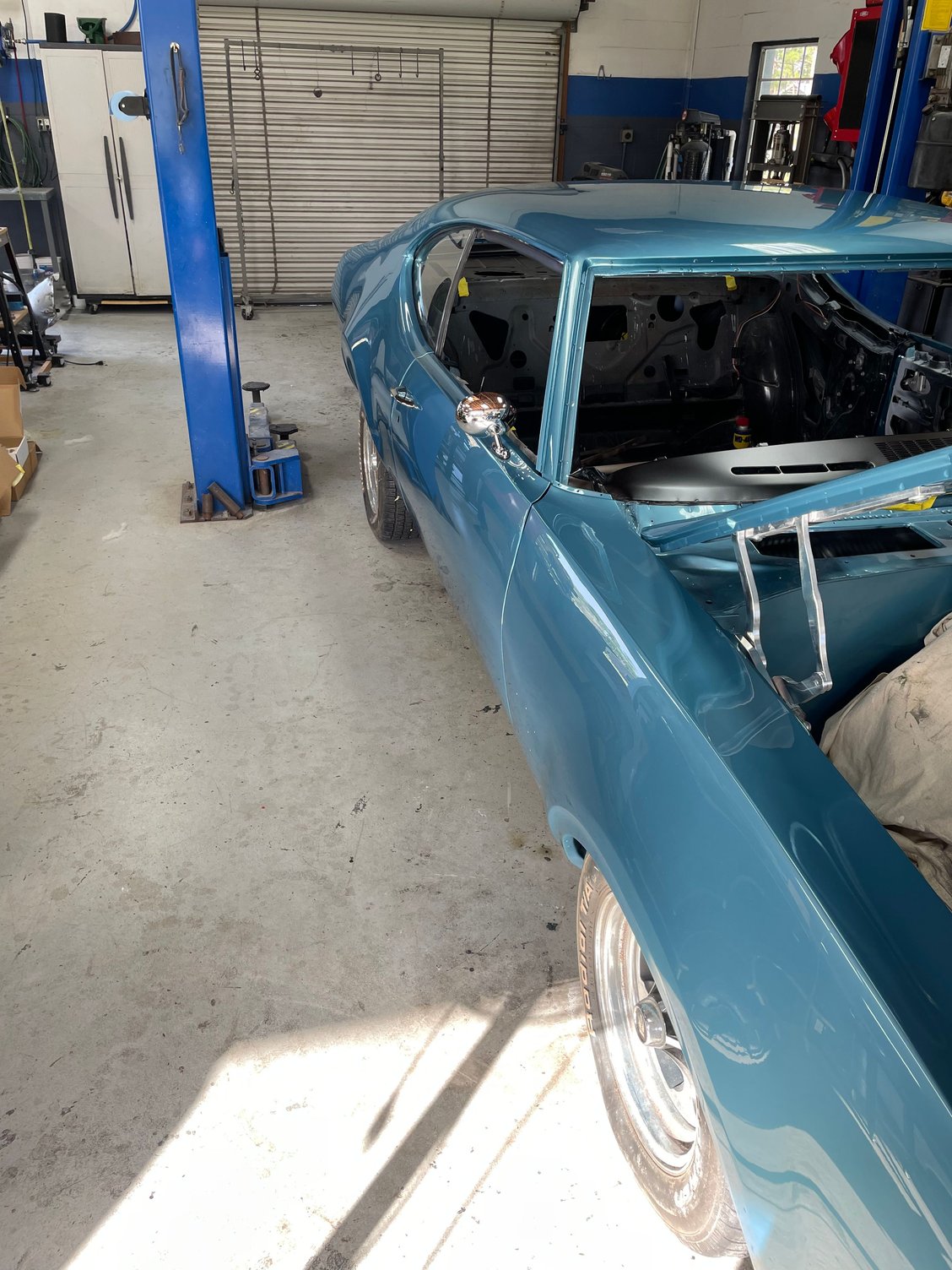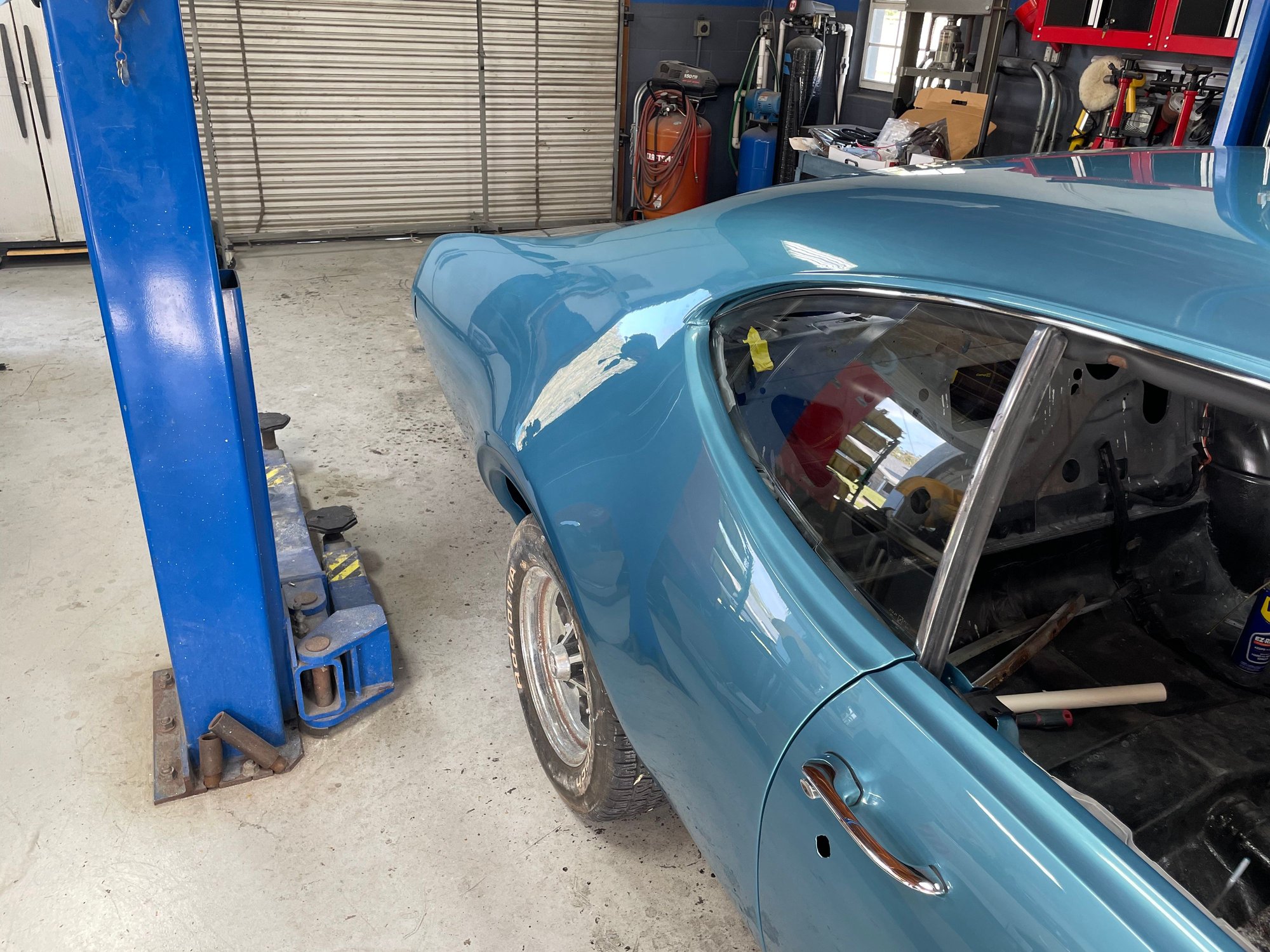 Have had this car for about 10 years and well she was just tired. 2 previous repaints with the last one severely lacking in quality. Car was from Texas and in really nice shape - only real trouble spot is a poor partial floor replacement. Goal is to have this done in a year, but when only getting a day a week it’s going to be challenging. 455/400/3.42 12 bolt all ready to go. Chassis going back together with Wilwoods all around. All removable body panels blasted and primed. Next is the body and not sure what I want to do with three coats of paint. Deciding between blasting, chemical paint stripping, Eastwood contour SCT tool or a combo. Tried paint stripper and it didn’t really make a dent. Probably going to put it on my rotisserie and have it blasted, I just worry about all the places the sand can hide. My guy is pretty good, but still. Going back with the original blue (code 55 Tahitian Turquoise) with white stripes.