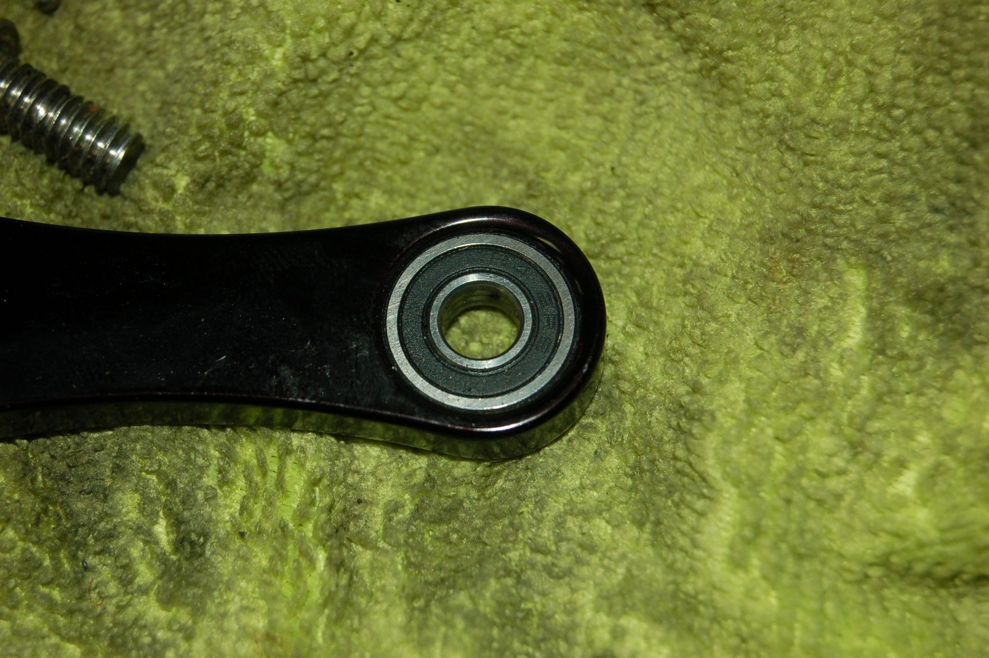 Here are some pics. My hinges came with 460 lb cylinders (times 2 = 920 lbs). When I ordered them, I got them for a stock flat hood for a 72 cutlass. After I discovered the problem, I bought 300 lbs (times 2 = 600 lbs) cylinders to replace them. The problem was that the bearings in the small links connecting the front and rear arms started to deform. The pics below show what happened after less than 1000 miles of driving. It would have destroyed the paint on the hood and fenders if I had not descovered the problem. With the 300 lb cylinders, the hood does not have a problem staying up at over 60 degress. Once the temps drop below 40, the hood does have trouble staying up, but it is worth it not to have to worry about the screws pulling out of my new links.