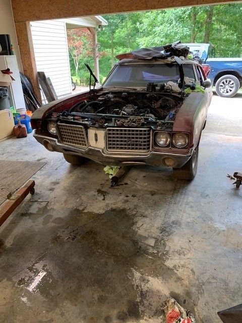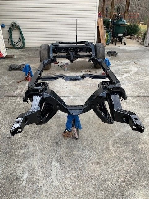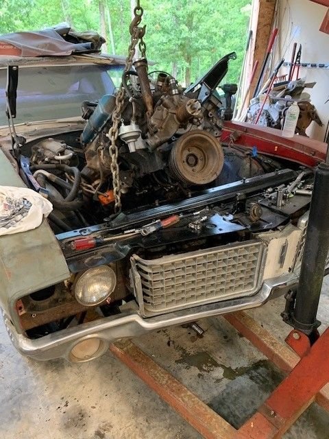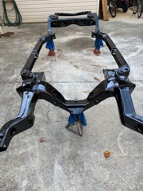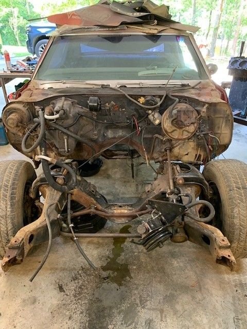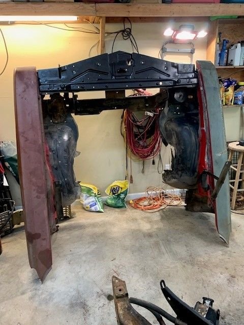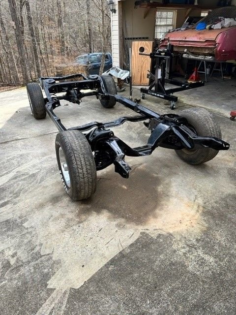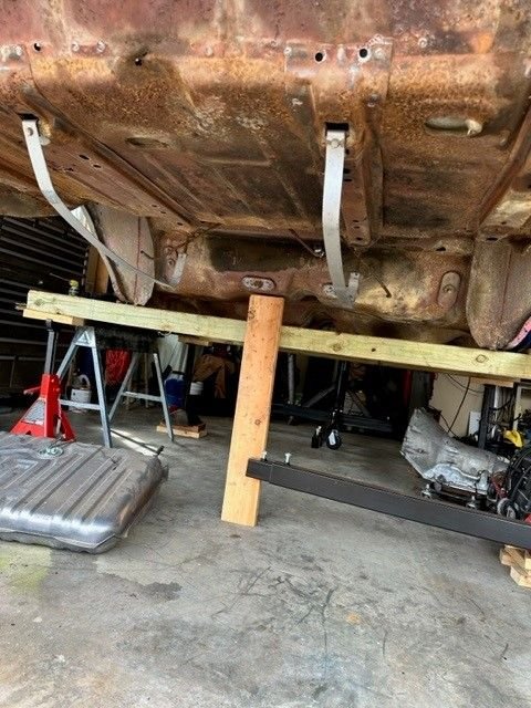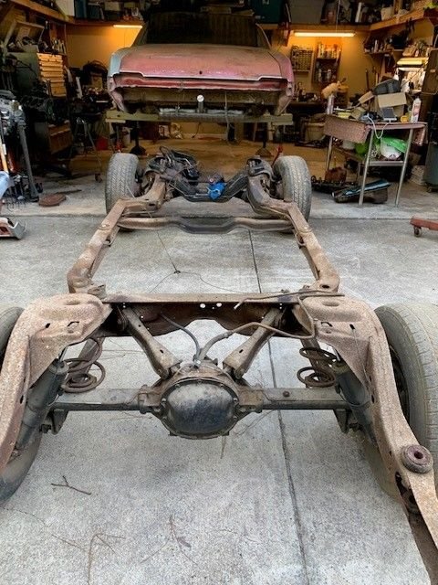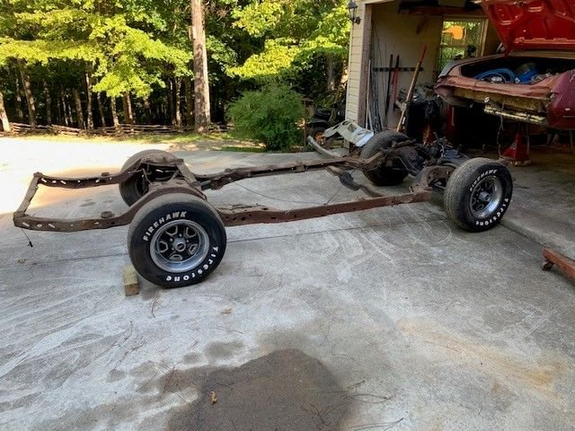 Hi All! so this is my first attempt at a frame off restoration. Of course this project didn't start out as a frame off resto, I've had this car since I was 20. I just wanted to get her road worthy and fix things as I went along. She had had been parked for about 10 years. I finally got it running last year but it wasn't running very good. The front oil seal was slinging oil so I started with that, which means you have to take off exhaust, starter, distributor cap, motor mounts, then jack up motor just to get the oil pan off. I then decided I was this far in I might as well go ahead and rebuild motor. I already had a new Painless wiring harness so I thought I can do this now that motor was out. Then thought well I already had body bushings so I might as well go ahead and take body off so now here I am! The rear body mount brace i had to remove that's the part I'm waiting on now. I cant mount the back Rotisserie until I cut out and weld in trunk patch and braces back in. Cars are not my full time job so working nights and weekends when I have a hour or two. this is what have gotten done in the past couple years. seems year one or any other body parts place takes forever to get parts. Sure gad I am not in a hurry!