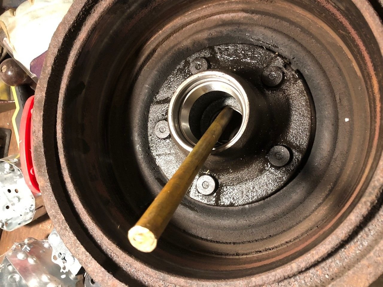 First stop on the rebuild, getting out those pesky old wheel bearings! I had a brass rod lying around and it seems to be working (tapping on alternate sides in the indents).