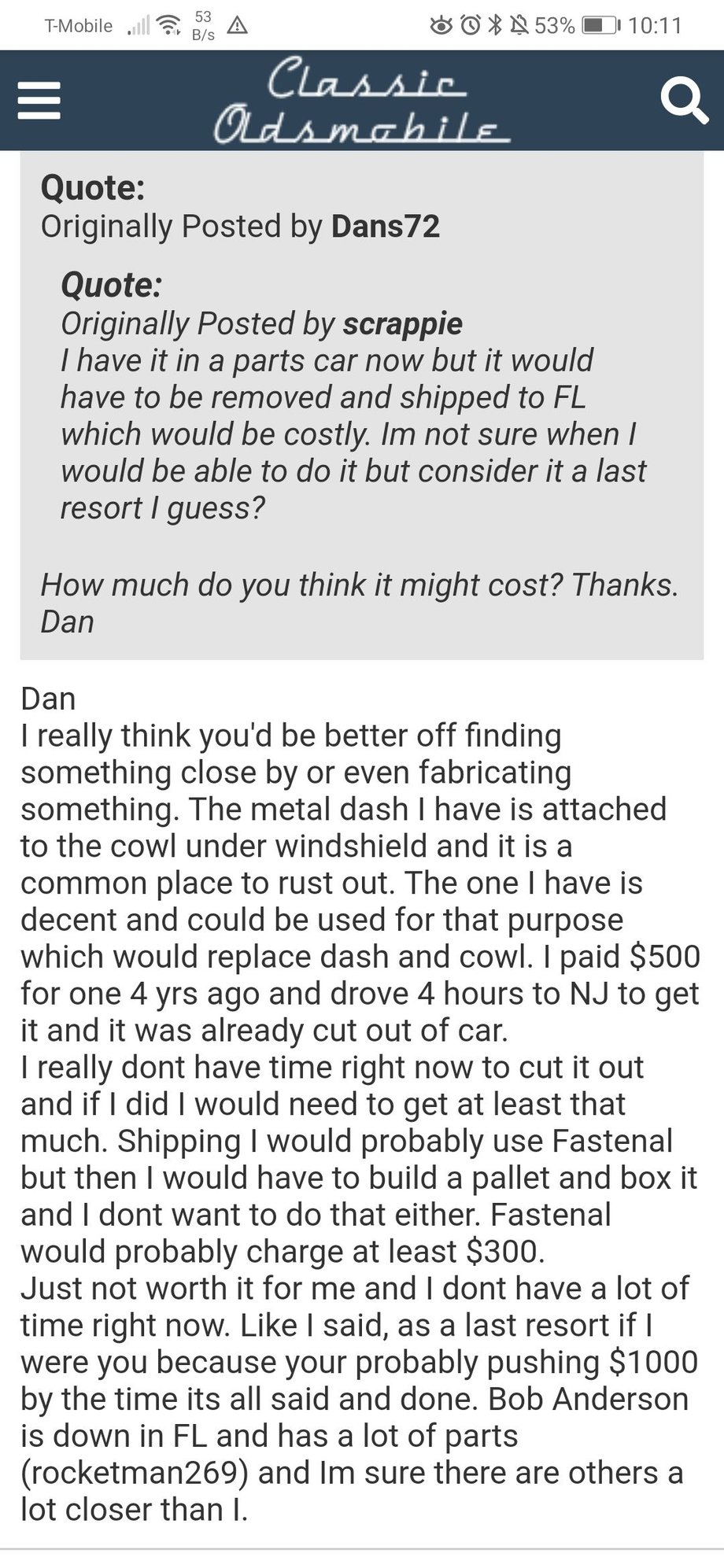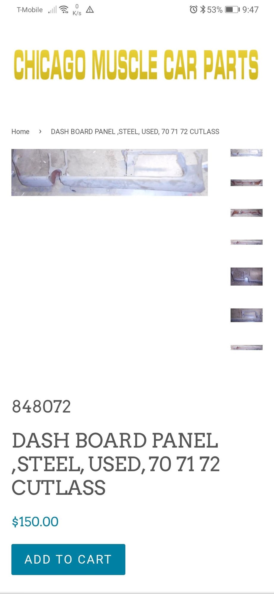 Hello so a couple years ago I customized my dash and installed new gauges and was happy for a long time but now I decided I want to restore it back to original and am remembering what the hell I did back some time ago and am beating myself in the *** for being such a moronic *** hole because I used a grinder to cut part of the metal frame that holds the dash and when I put it back to stock you'll see a huge cut and it'll look like **** and I scowerd the internet and found tras It looks like they sell it in chevelle but not cutlass This was the only thing I found and tried to contact them and no response so checked out reviews and supposedly this place is ran by one guy and hes a mess with shipping things All the holes there and the 2 light switches were there when I bought the car just so you don't thing I'm more crazy than I already am and same with the radio Here's s what I had done with the dash/ Interior previously And here's what it looks like now!!!!! 🤪