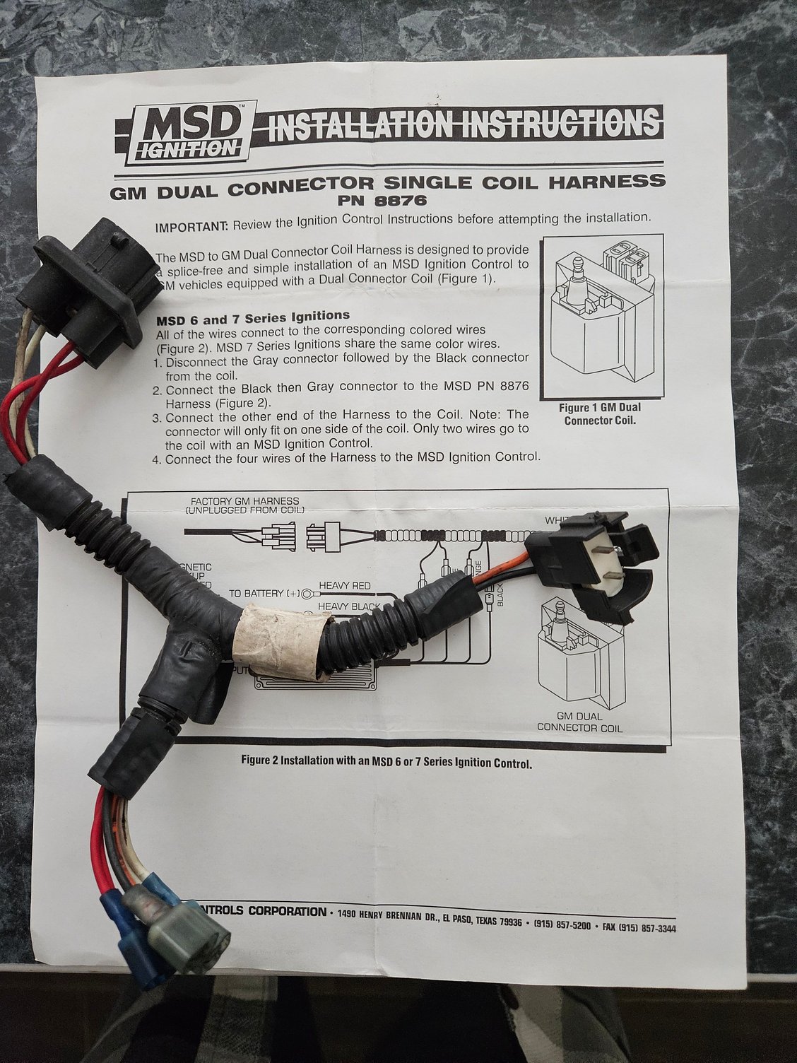 MSD8876 harness adapter to connect MSD Series 6 or 7 ignition control to GM dual connector single coil. This is used with the small cap HEI on many GM vehicles from 1983 to 1998 including various Oldsmobile models. $35.00 plus shipping from 31548.