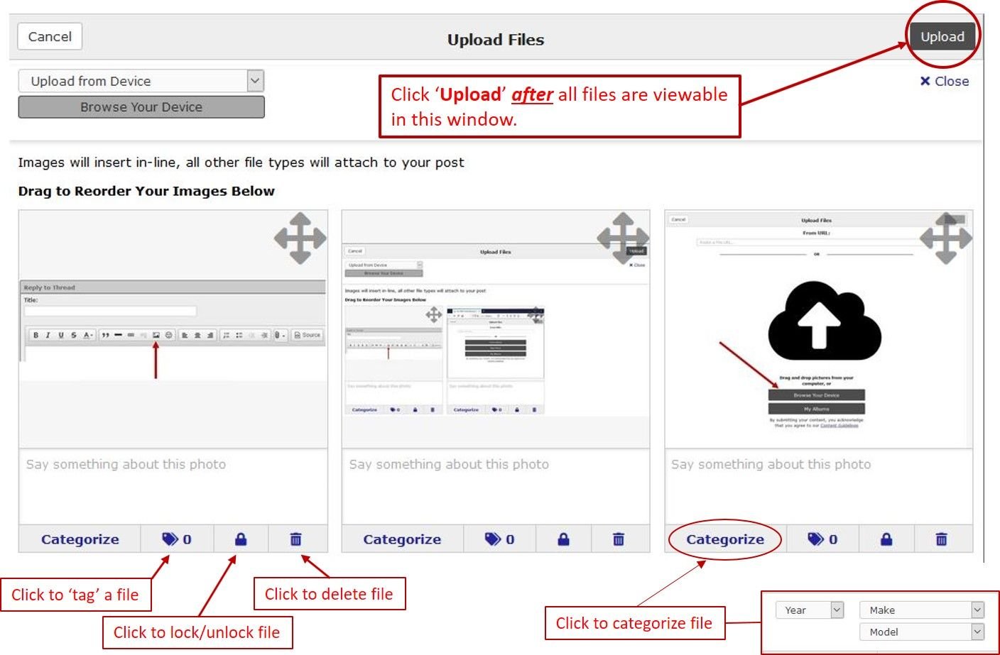 Next, click Upload only afterall files are viewable in the following window (below). Ensure your images are arranged in-line in the order you want them viewed, add tags, categorize, and/or delete any files, etc.