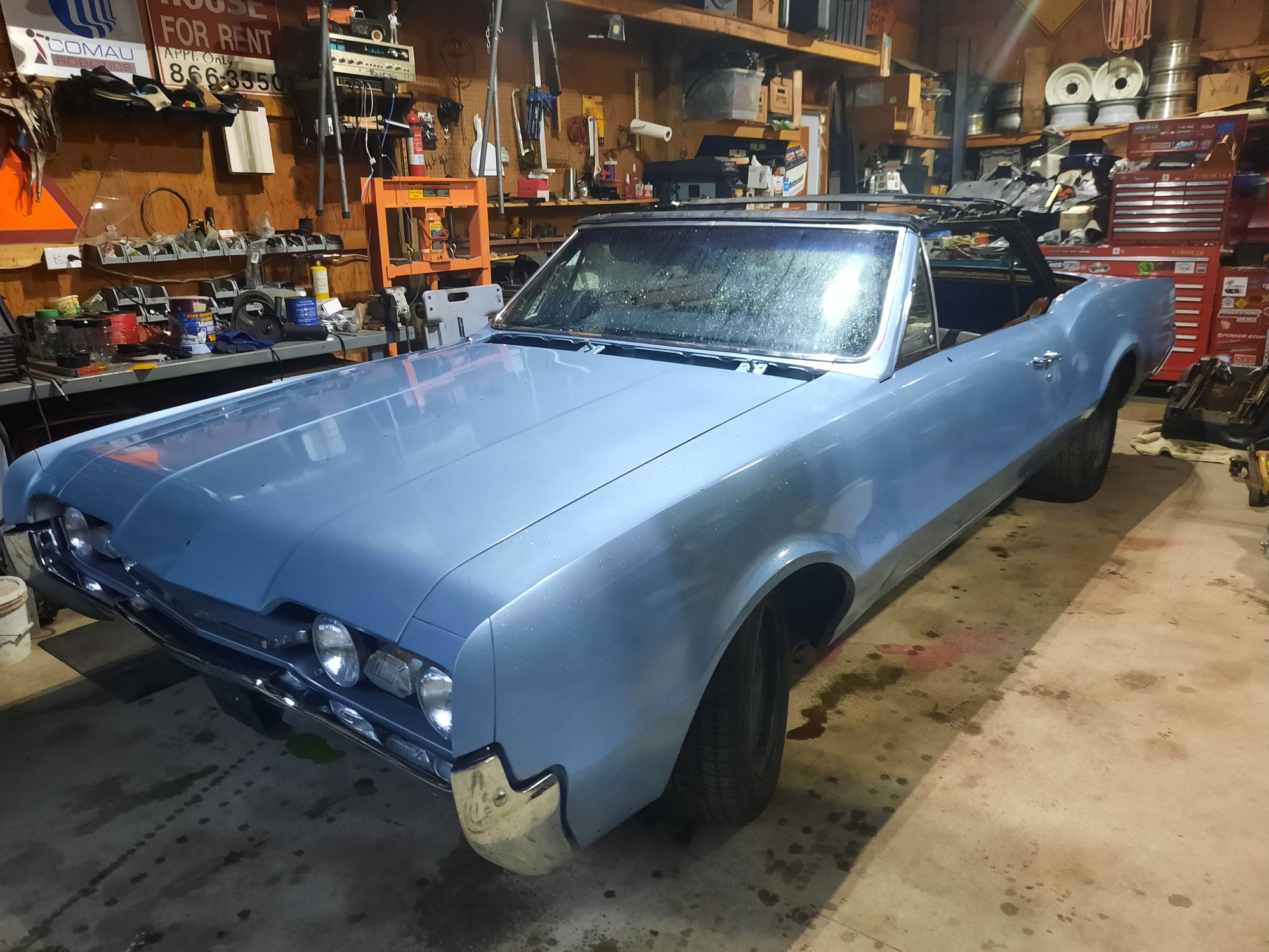 I bought this car in high school, too many years ago to remember. Hit by another car in the early 90's. Started a rebuild, fresh paint, new motor, and then life parked it for 30 years. 1967 Cutlass convertible 455 built for torque. Fresh gas and it fired right up and runs strong.