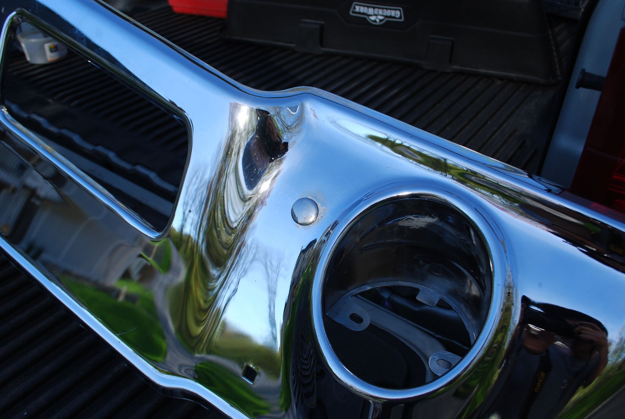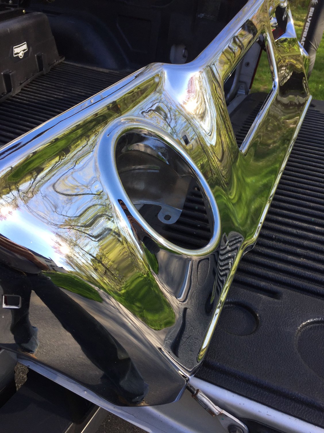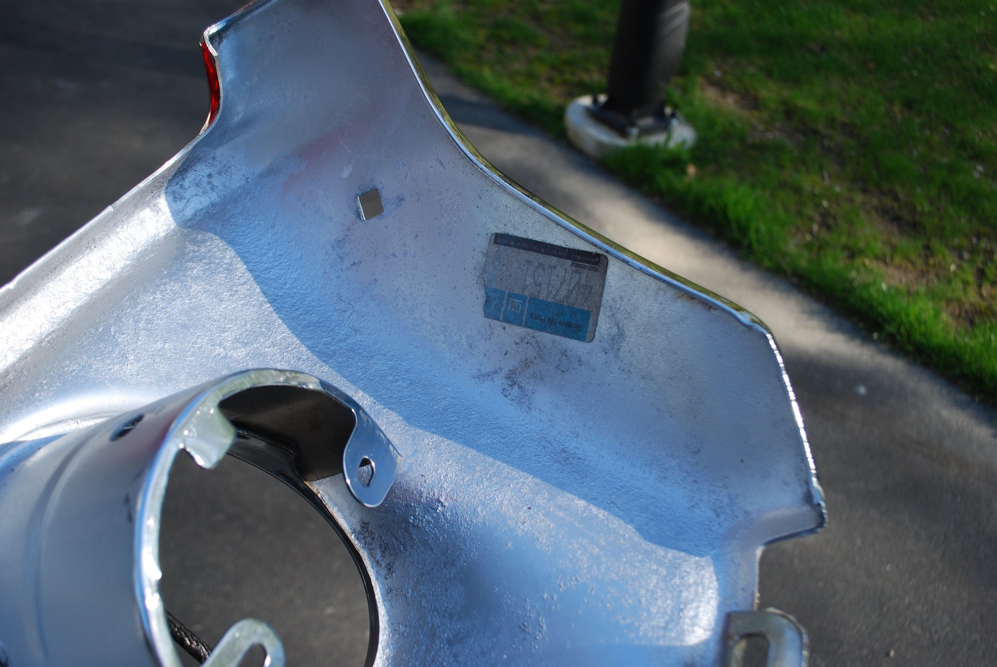 NOS front bumper with minor imperfections but legit NOS piece. A few small pits on lower portion and around two bolt holes. One bolt hole is covered with bolt head and the other shows minimum. Surface rust started underside and was painted over. A great driver bumper or even for rechrome. Never been mounted. $400 plus shipping.