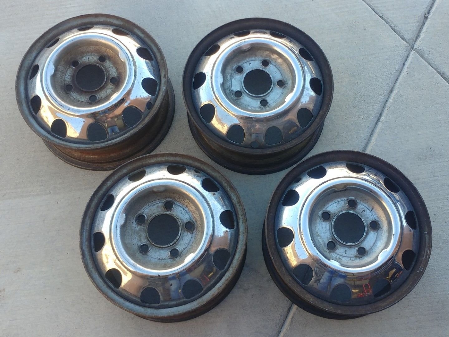 I did finally get all four ebay rims, three from one seller and the fourth from another. Paid about $60 apiece plus shipping for the three and $45 plus shipping for the fourth. I wire-brushed them clean of grit and dirt and then sprayed some paint on the visible side. I think they cleaned up pretty well for 30 minutes work. Later in the week I'll get a chance to have the tire shop swap the tires onto the replacement rims.