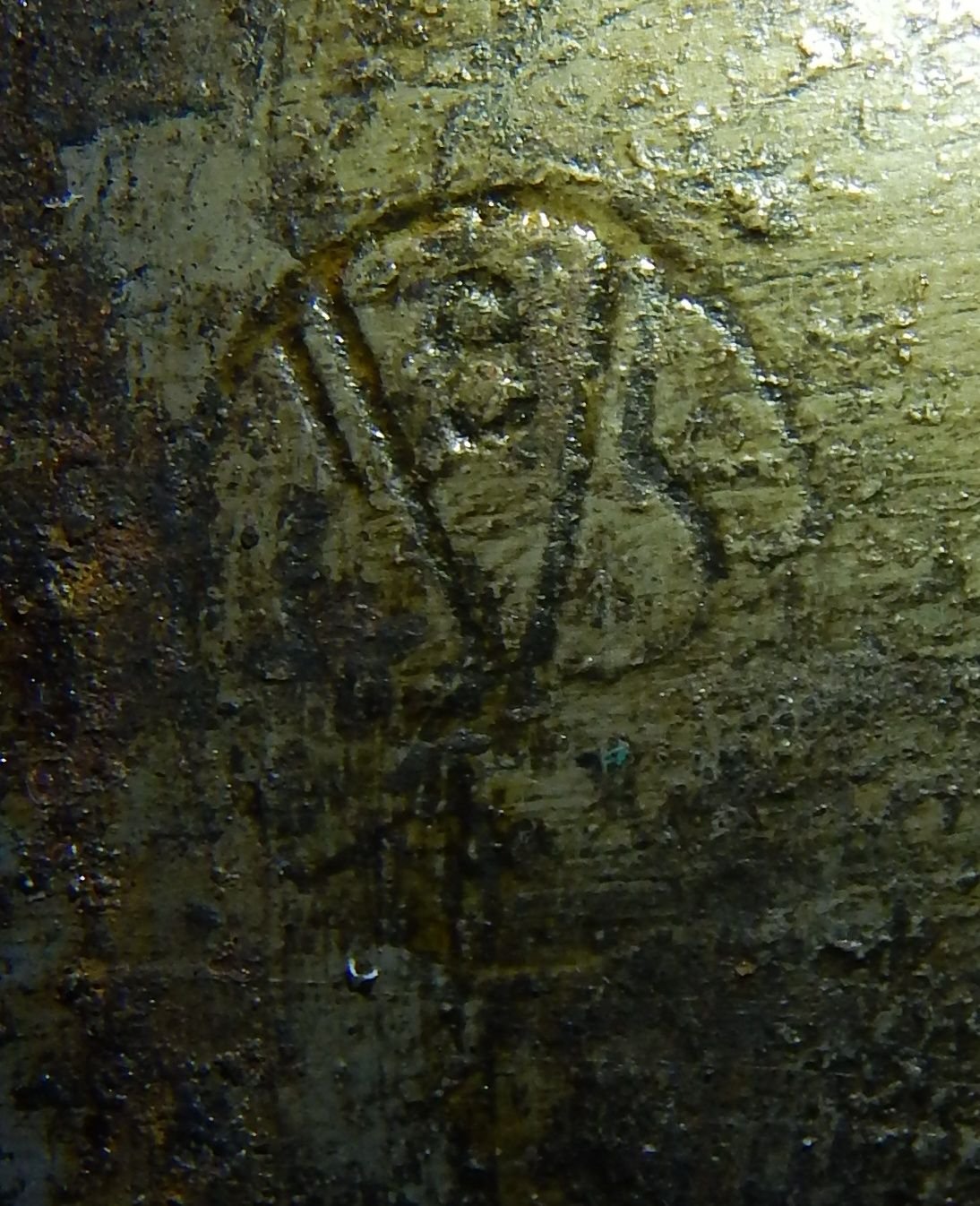 Then there's this, which is on the same wheel as has the "67." Looks like something from the Da Vinci Code. It's a circle with a V at the top with an 8 inside it, and then a line on each side of the V that starts parallel to the V and then bulges out before curving back to the point of the V. As I say, I'm sure Robert Langdon could figure it out.