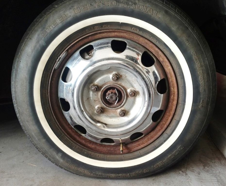 Here's a photo I took early on, showing one of the old wheels with the dog-dish cap. Imagine that rim all cleaned up and the chromed part painted a glossy dark maroon like the car. Good idea? Dumb idea?