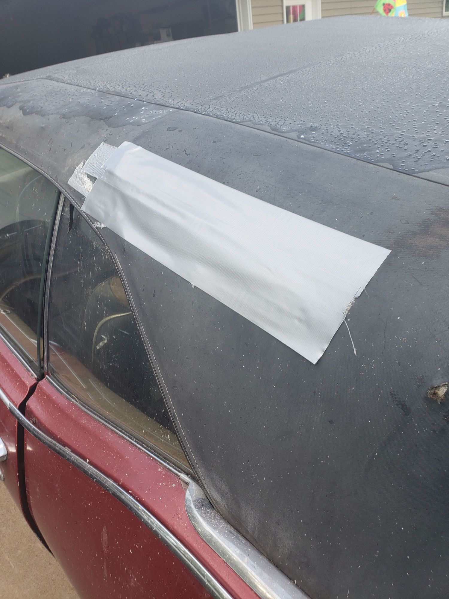Convertible top repair. Just trying to keep it dry inside until I can get it in the garage.