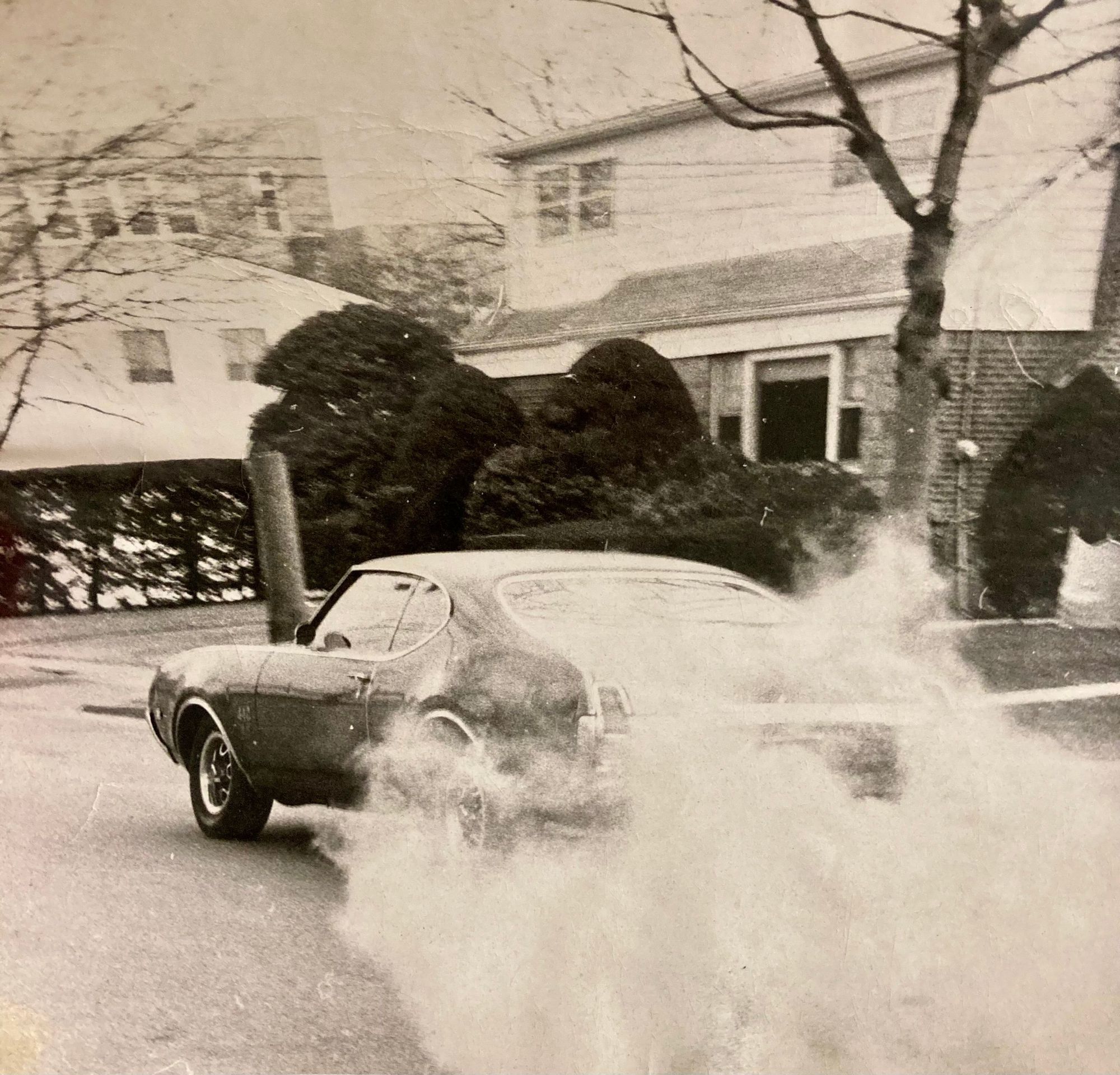 March 1975: Trophy Blue ‘69 442 W-30 automatic lighting up the tires as a high school senior in front of Valley Stream Central HS, Long Island.